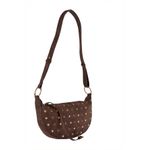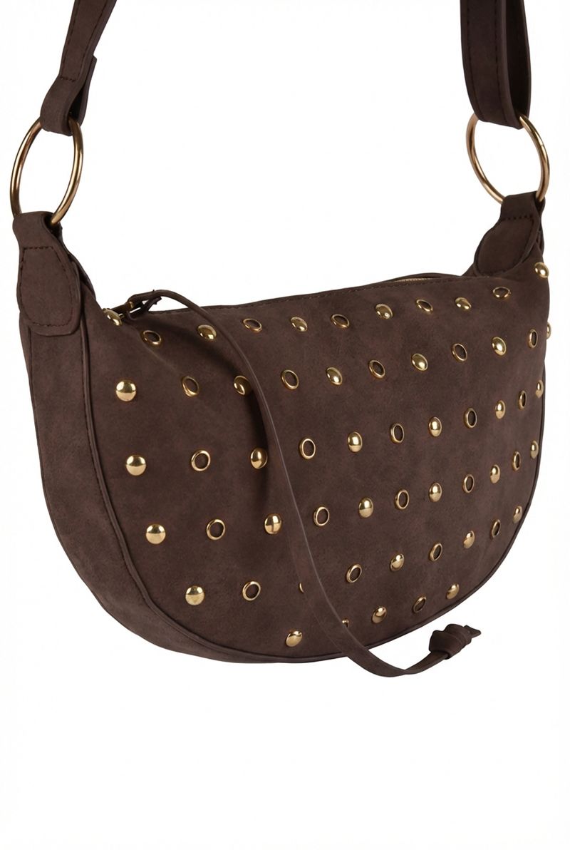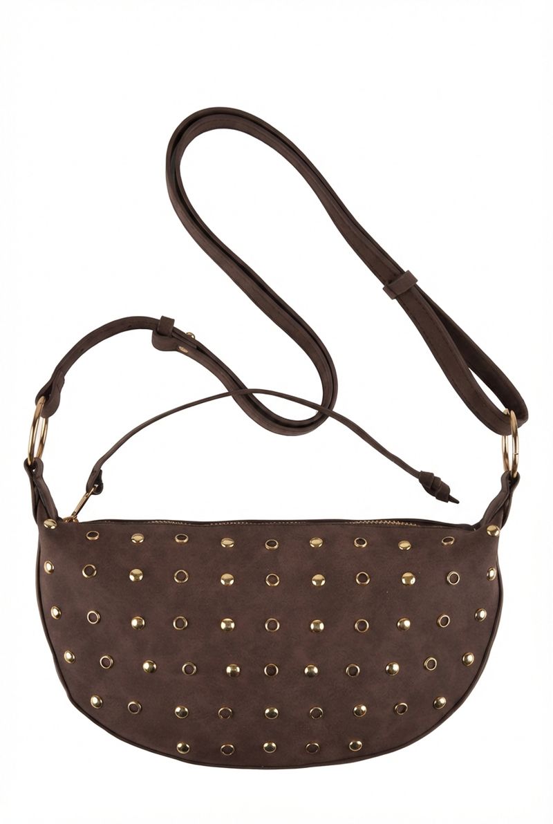 Eleve seu estilo com a Bolsa Croissant Feminina Caedu. Seu design moderno em PU marrom escuro, adornado com tachas douradas, oferece sofisticação e praticidade. Perfeita para quem busca um acessório único e versátil na moda.