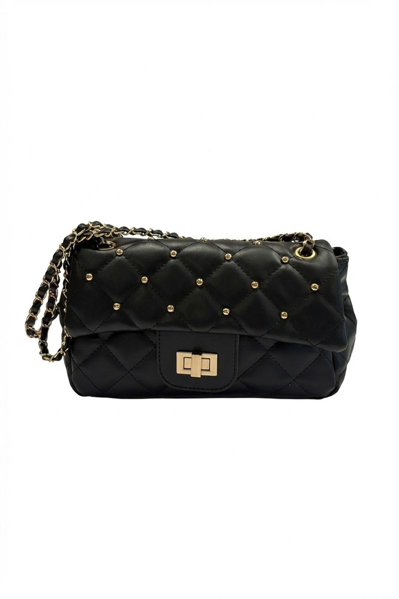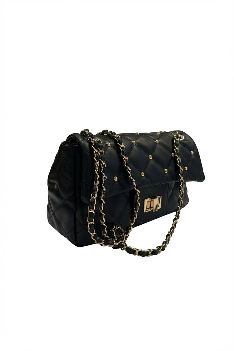 Eleve seu estilo com a Bolsa Feminina Matelassê Preta Caedu. Perfeita para quem busca elegância e praticidade, esta peça essencial da moda apresenta design sofisticado com padrão acolchoado, alça de corrente e tachas douradas, ideal para suas roupas Caedu.