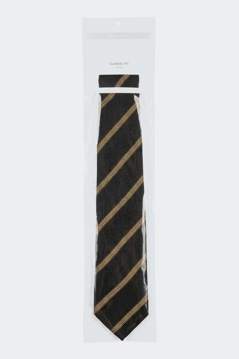 Eleve seu estilo com a Gravata Masculina Caedu Classic Fit. Confeccionada em 100% poliéster, oferece toque suave e caimento impecável. Seu design elegante em preto com listras douradas e brancas adiciona sofisticação a qualquer look, garantindo um visual marcante e moderno.