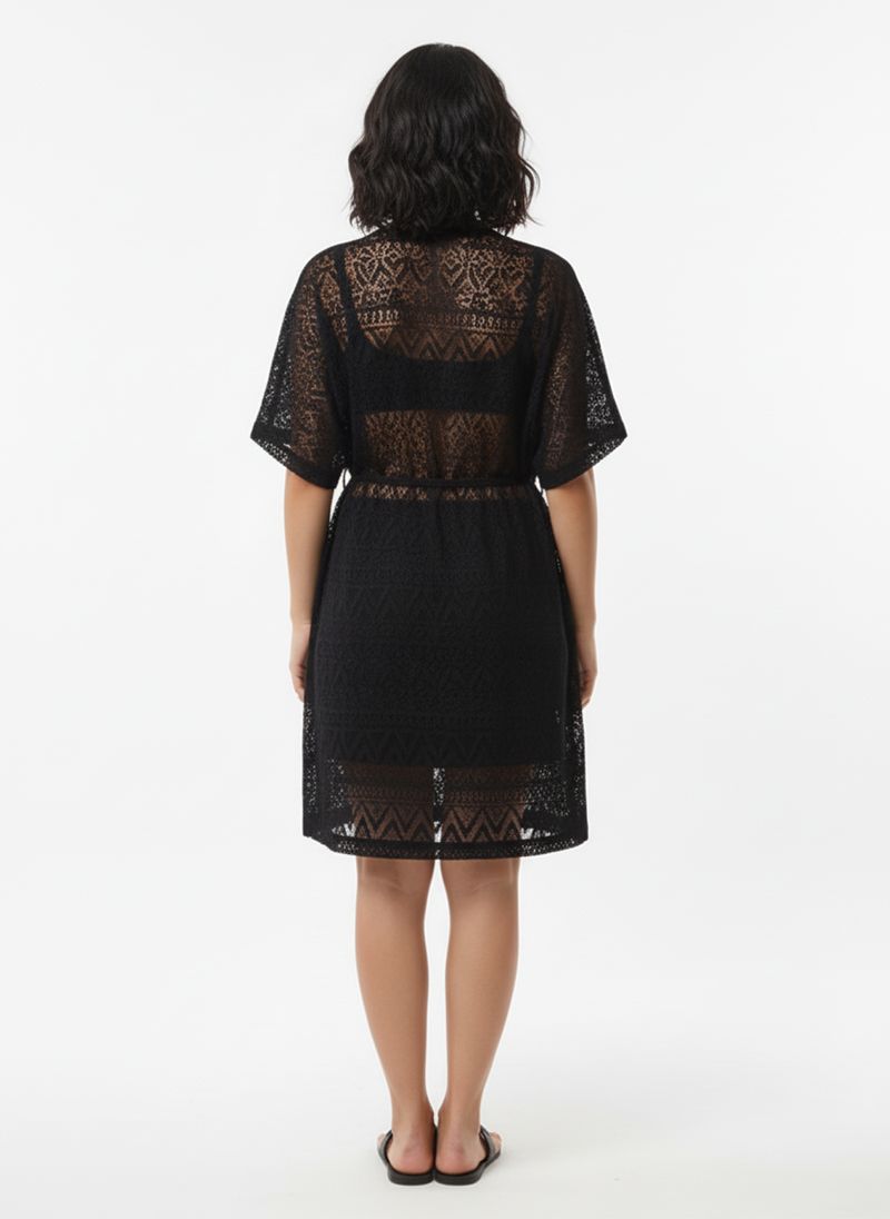 Deslumbre-se com a Saída de Praia Kimono Renda Preta Caedu, a peça essencial para seus momentos de lazer. Com seu design elegante em renda vazada e amarração na cintura, este kimono oferece um toque de sofisticação e conforto, perfeito para realçar sua beleza natural na moda praia.
