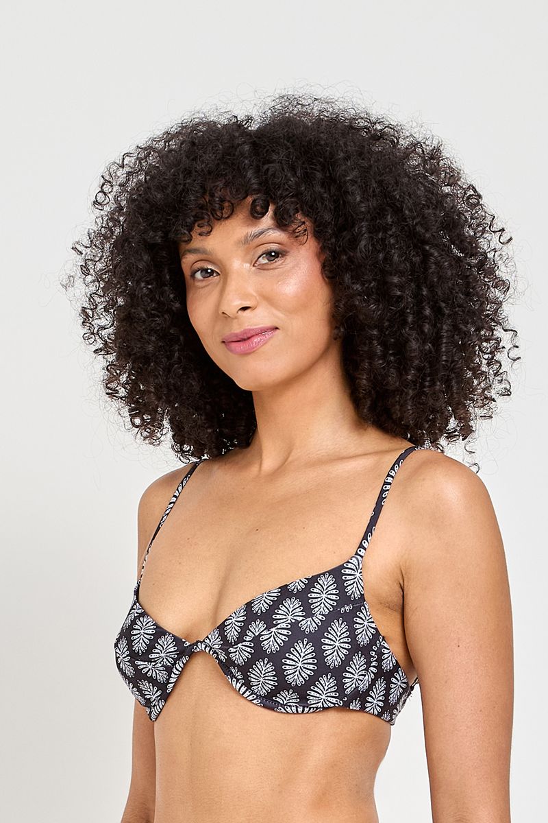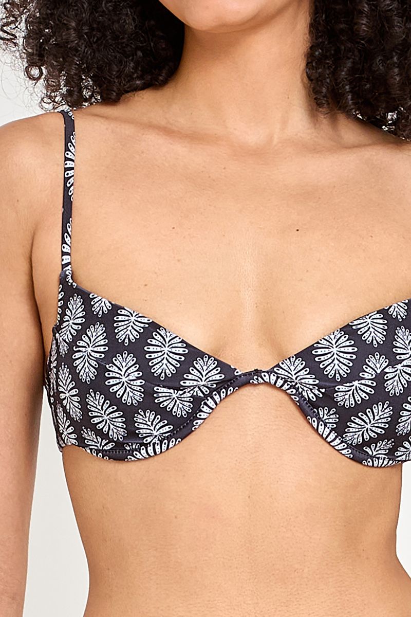 Detalhes: Estampa botânica noturna, bojos definidos, detalhe torcido, alças ajustáveis