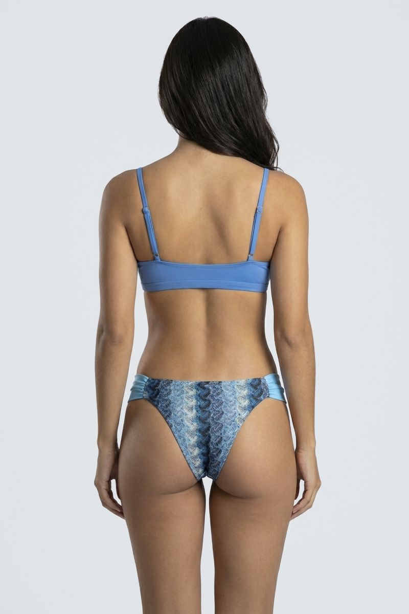 Combine sua calcinha de biquíni com um top liso azul para um visual coordenado, ou um top branco para um contraste elegante. Adicione uma saída de praia leve, sandálias rasteirinhas e óculos de sol para um look completo e despojado. Perfeito para a moda casual de verão.