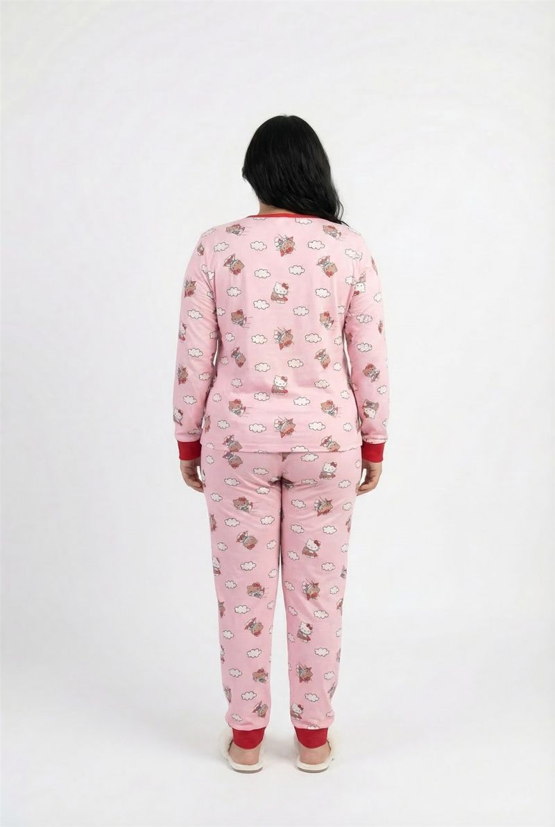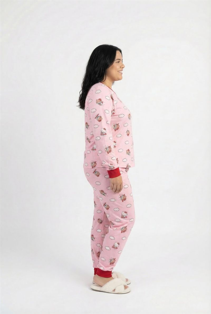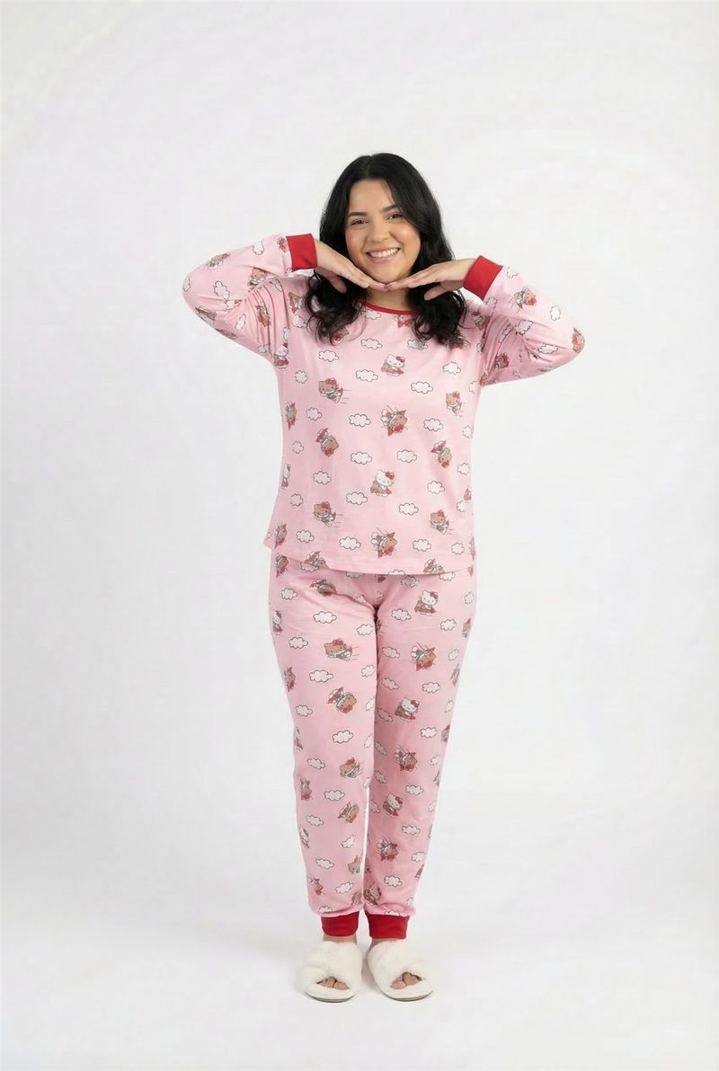 Sinta o conforto e a alegria com o Pijama Feminino Hello Kitty Caedu. Conjunto de veludo rosa, blusa e calça estampadas com nuvens e personagens divertidos. Ideal para noites aconchegantes, com detalhes em vermelho vibrante que adicionam charme e bem-estar.
