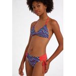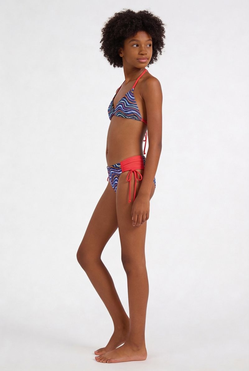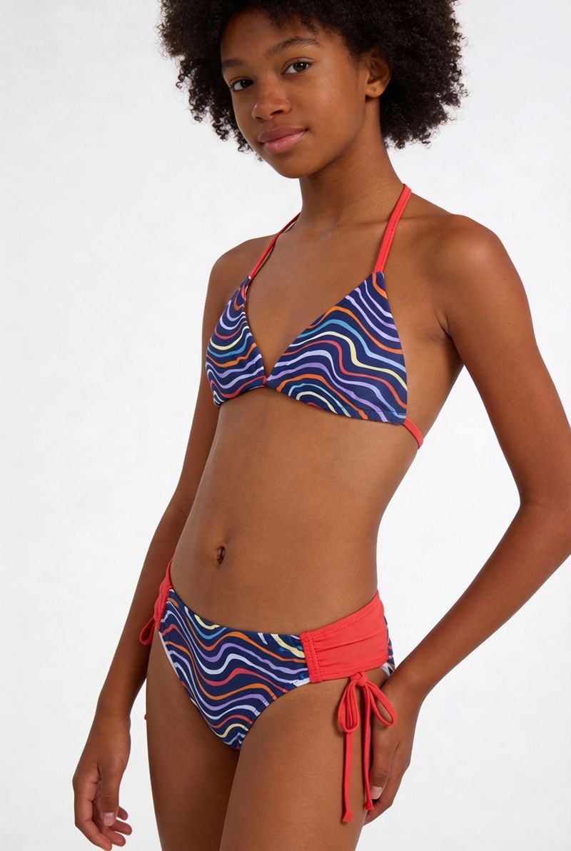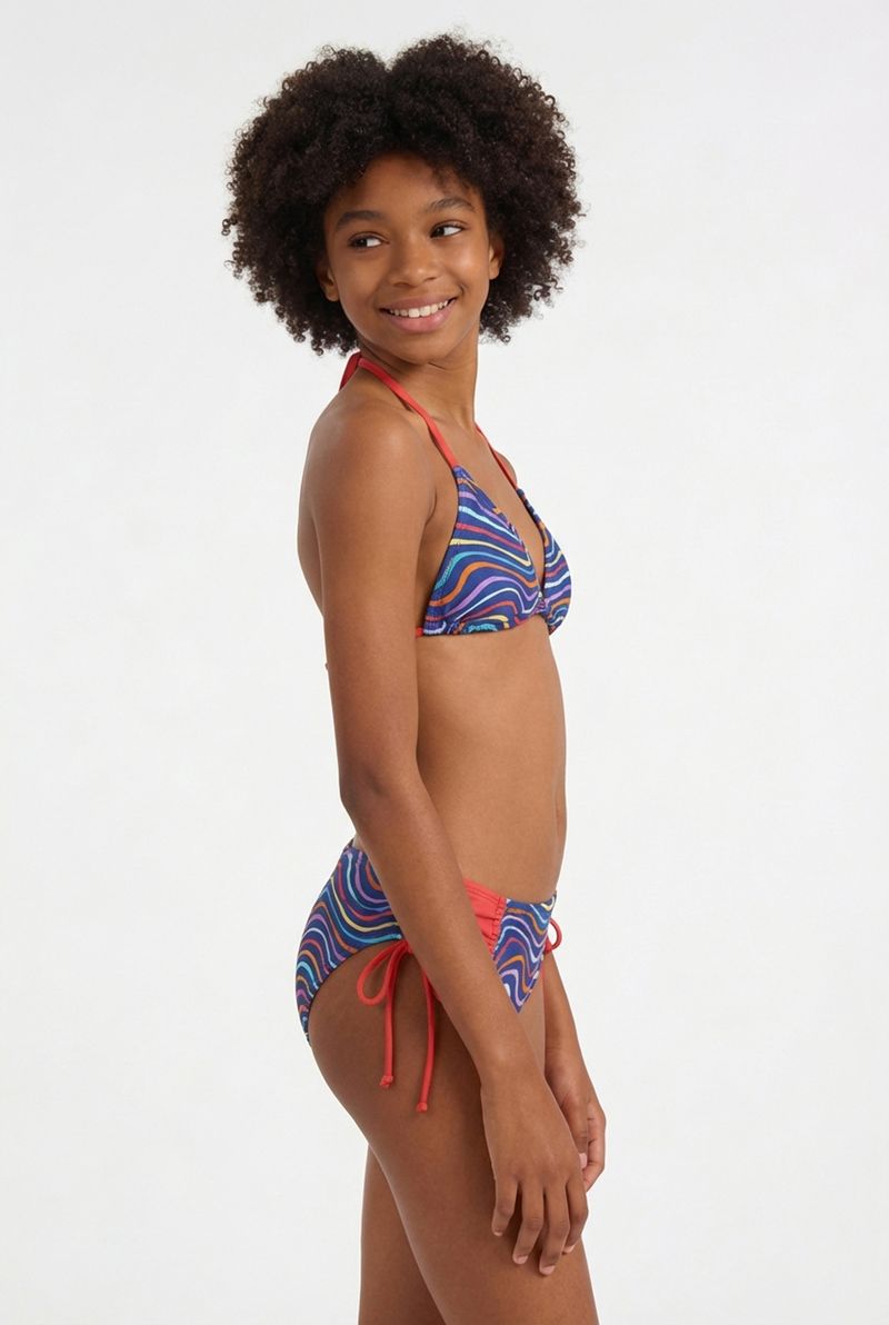Conjunto Biquíni Juvenil Caedu! Com estampa de ondas coloridas e design triangular, este conjunto oferece conforto e estilo. As amarrações laterais garantem ajuste ideal, perfeito para a