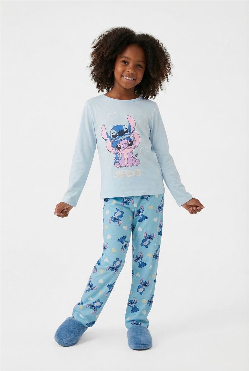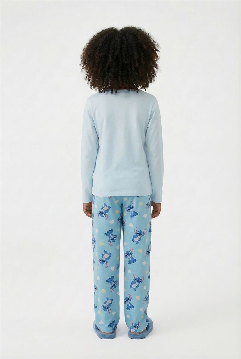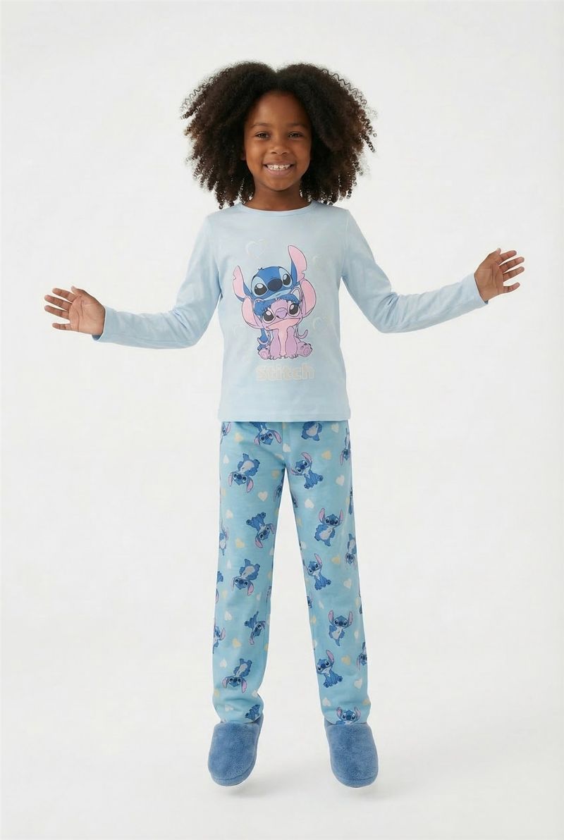 Este pijama infantil da Caedu, em azul claro, é perfeito para noites de sono tranquilas e momentos de diversão. Confeccionado em polybrush com elastano, oferece conforto e maciez, enquanto a estampa de Stitch e Angel com corações encanta as crianças, tornando a moda íntima mais alegre.