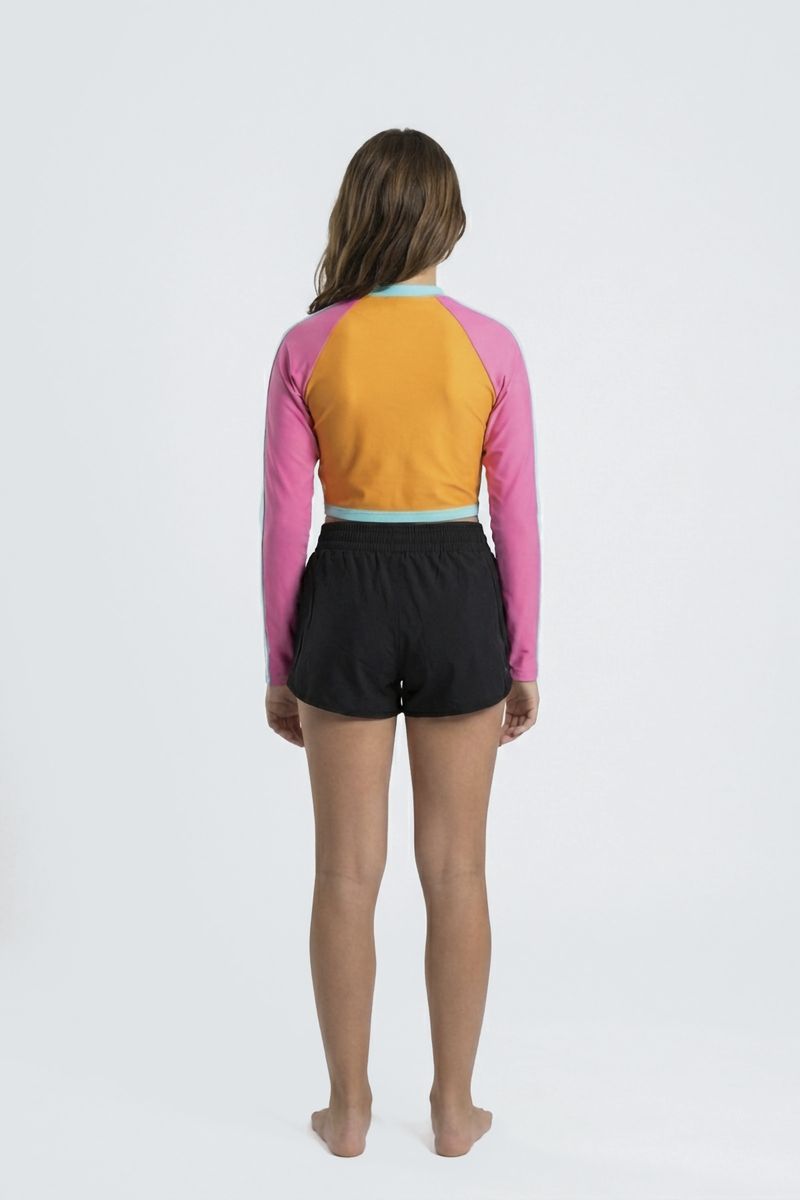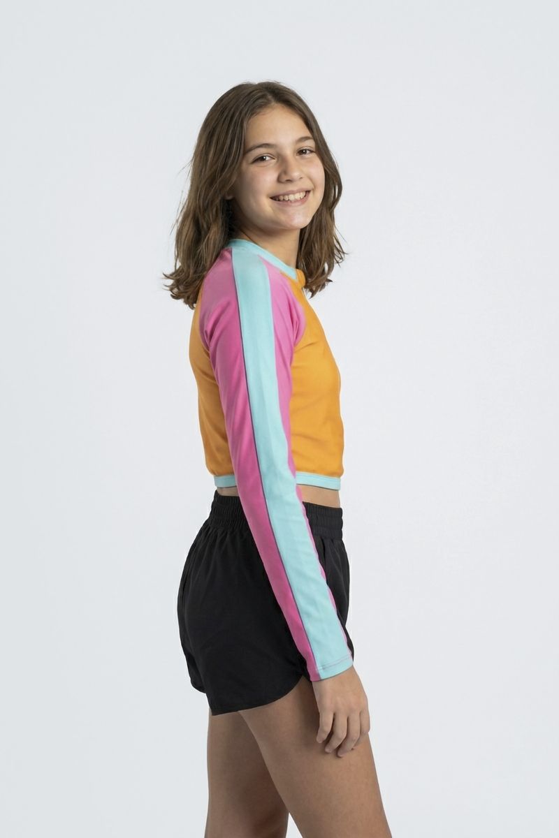 A Rash Guard Cropped Juvenil Caedu Aces é a roupa perfeita para a praia! Com proteção solar e manga longa, seu design colorido e florido garante estilo e segurança, essencial para a moda infantil.