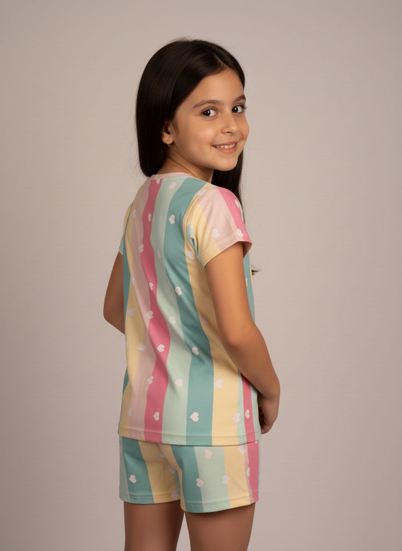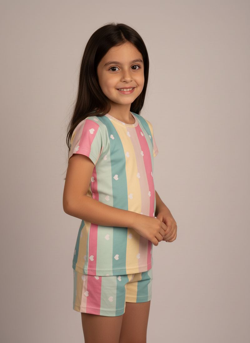 Desperte a magia das noites com o Pijama Infantil Curto Sonho Doce Caedu. Confeccionado em POLYBRUSH (95% poliéster, 5% elastano), este conjunto estampado com listras candy colors e corações oferece máximo conforto e suavidade para um sono tranquilo e cheio de estilo. Ideal para meninas que amam moda íntima.