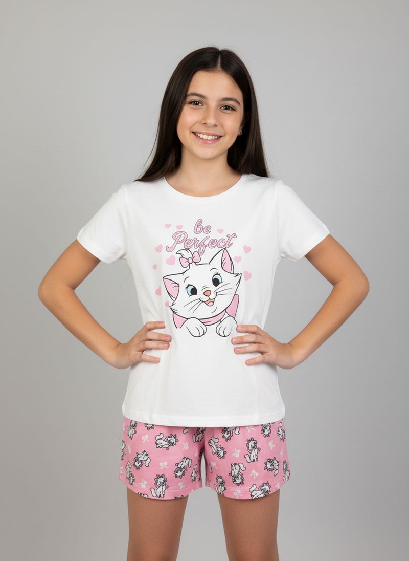 Inspire-se com o Pijama Curto Juvenil Marie Estampado 'Be Perfect' Caedu. Conforto e estilo em polybrush. Blusa com estampa da Marie e shorts rosa vibrante para um visual encantador no descanso.