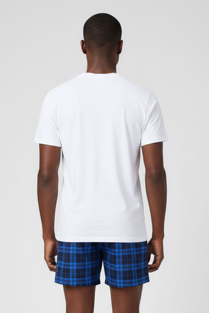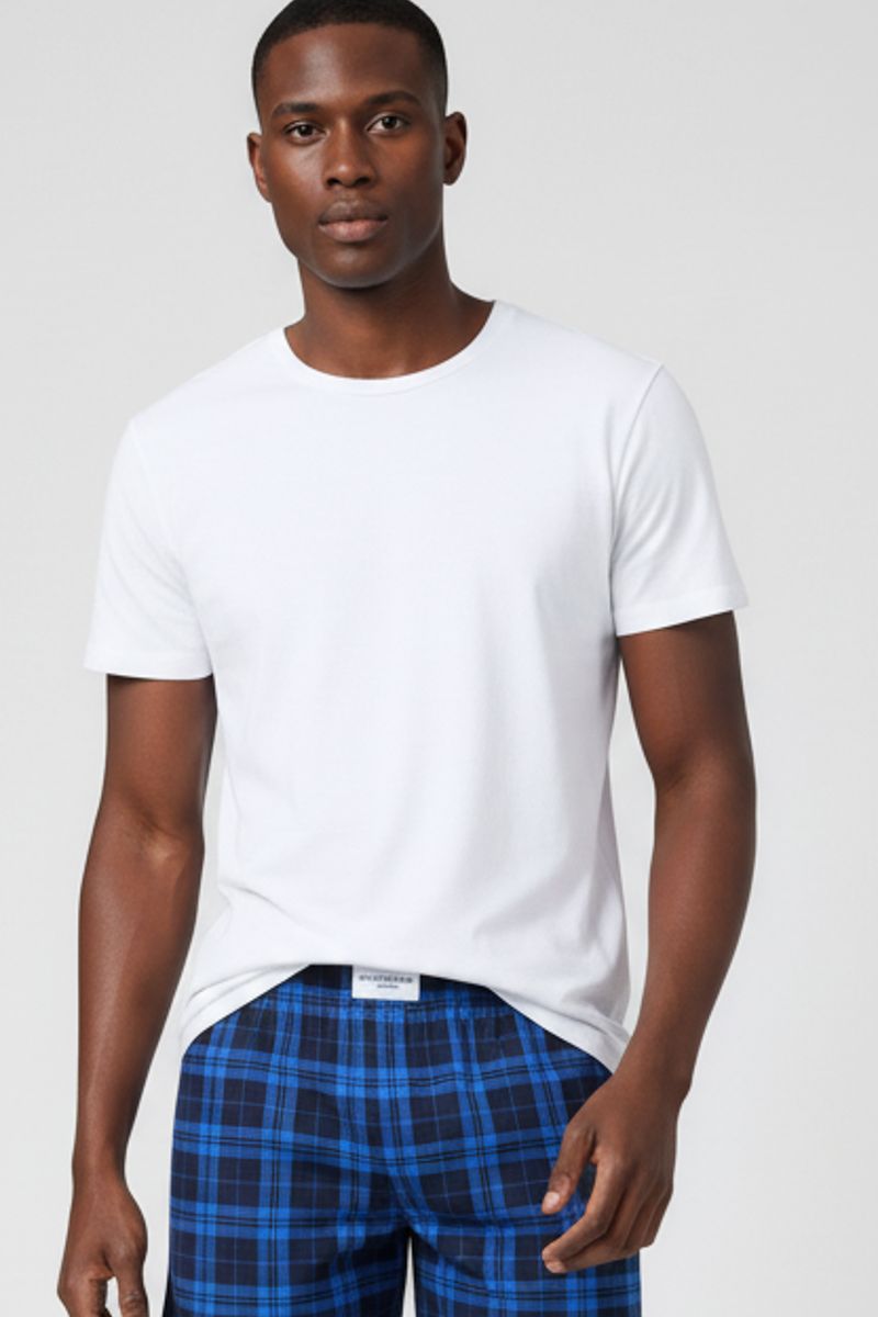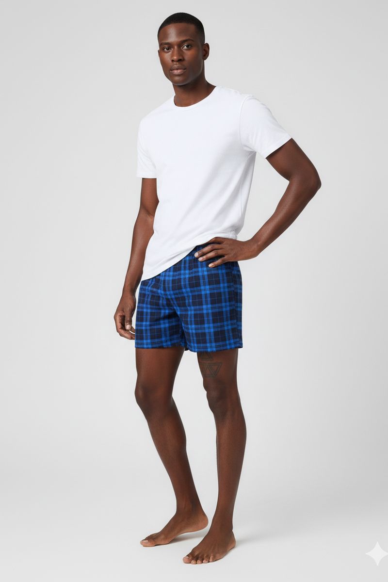 Combine seu Shorts de Pijama Masculino Xadrez Azul com uma camiseta básica de cor neutra, como branco ou cinza, para um visual coordenado e relaxante. Para completar o look de descanso, opte por chinelos ou pantufas confortáveis. Uma escolha versátil para suas roupas de dormir.