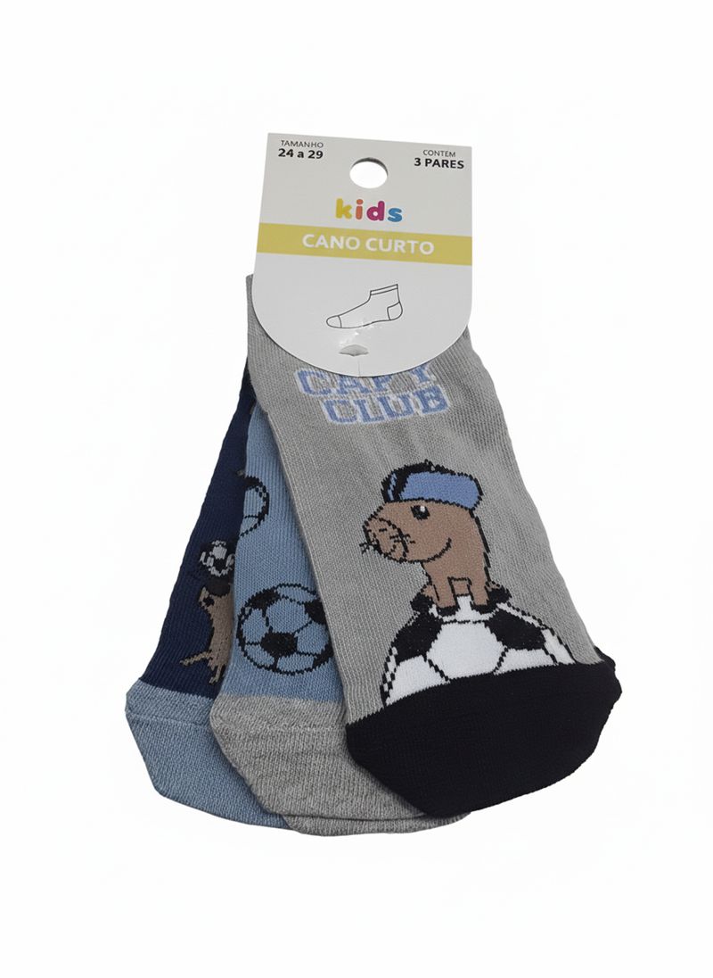 O Kit 3 Pares Meias Infantis Cano Curto Estampadas Capivara Futebol Caedu oferece conforto e diversão. Em algodão, são macias e duráveis. Com estampas de capivaras e futebol, estas meias são ideais para o dia a dia, adicionando alegria à moda infantil.