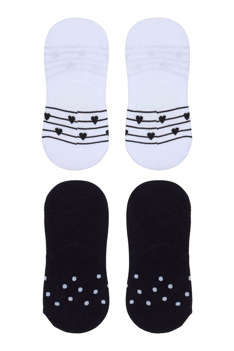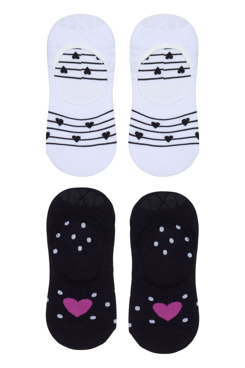 Conforto e discrição com o Kit Meias Invisíveis Femininas Estampadas Love Caedu. 2 pares em algodão e elastano, modelo sapatilha com estampas de corações e poás, e calcanhar antiderrapante. Ideal para sua moda e praticidade diária.