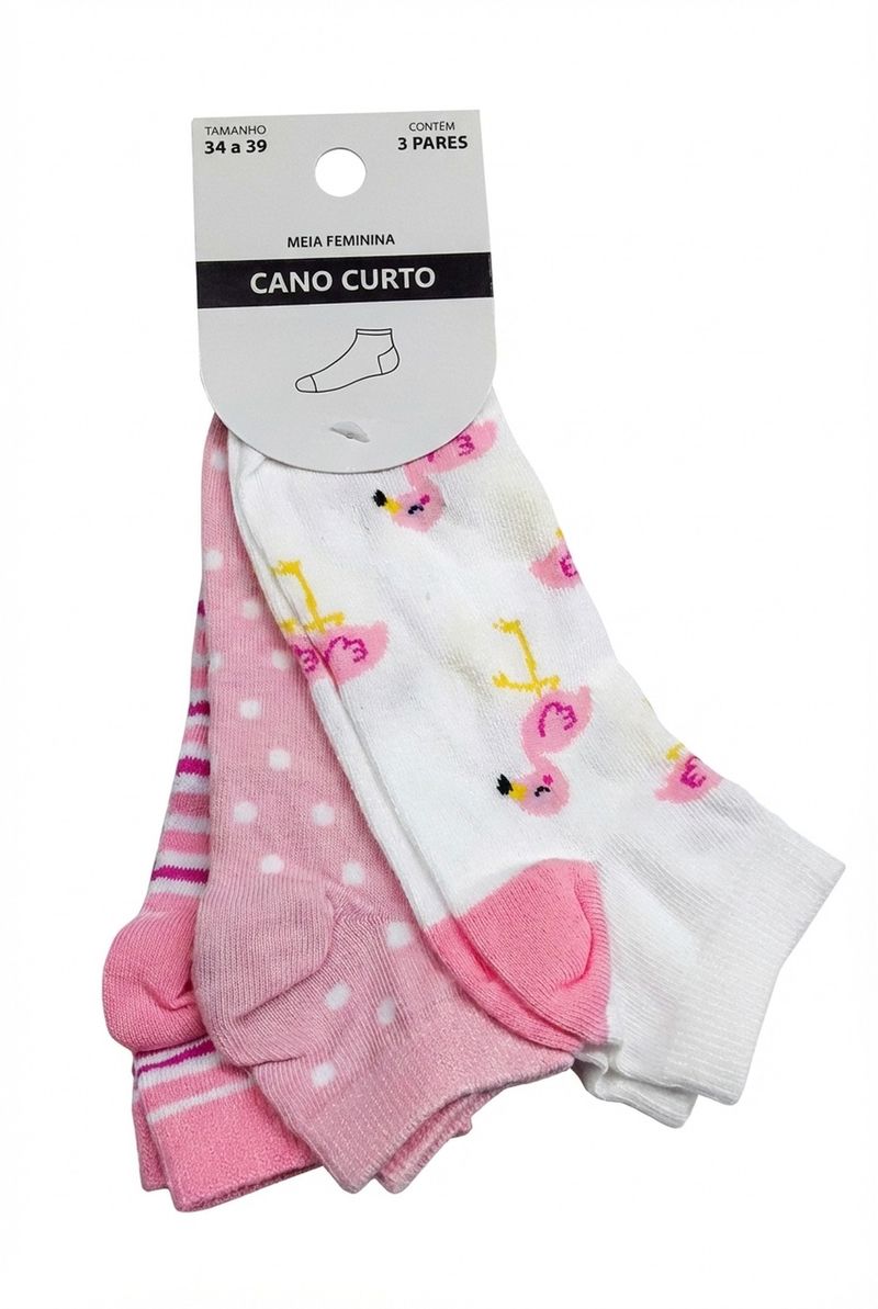 O Kit 3 Pares Meias Femininas Cano Curto Caedu traz alegria e estilo aos seus pés. Com estampas divertidas de flamingos, poá e listras rosa, estas meias são ideais para o dia a dia. Feitas com 97% algodão, garantem conforto e maciez, um toque de moda essencial.