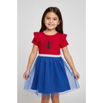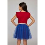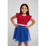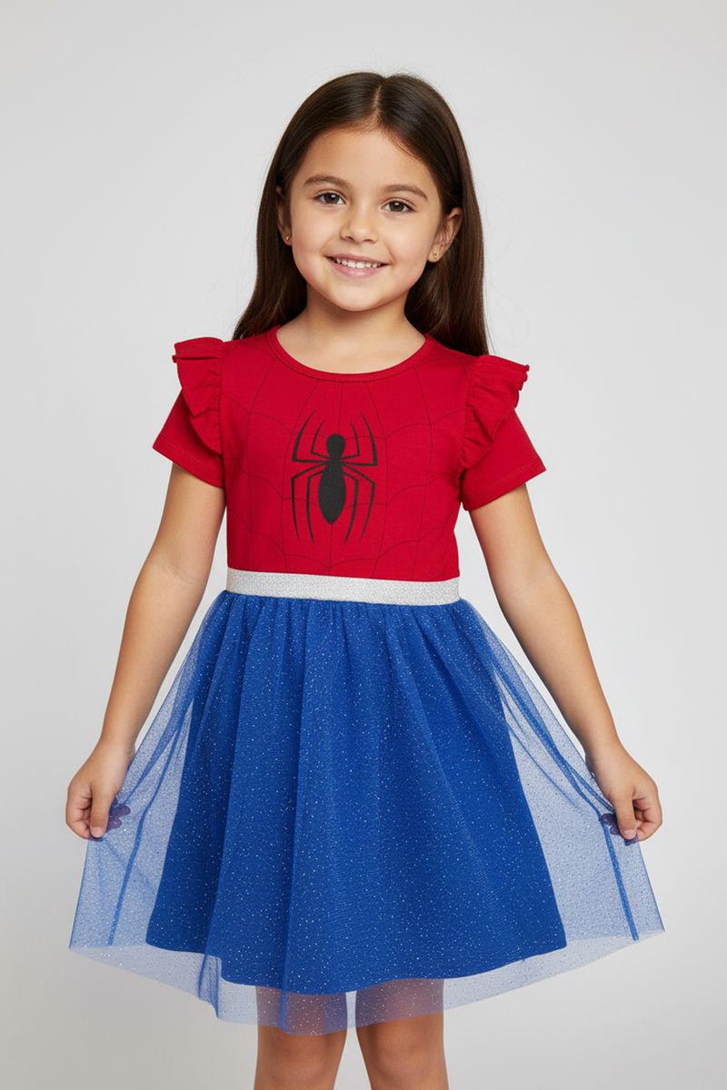 Detalhes: Estampa Homem-Aranha, mangas com babados, saia de tule azul com glitter