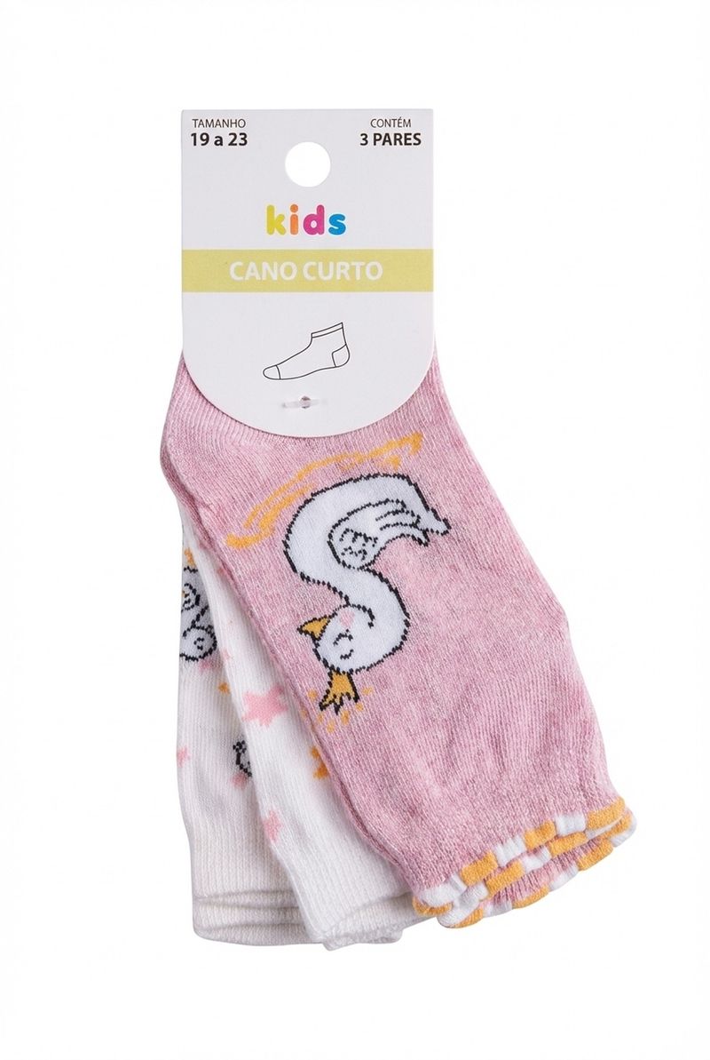 Proporcione o máximo conforto e estilo para os pezinhos com o Kit 3 Pares Meias Infantis Caedu. Confeccionadas em algodão macio e elastano, estas meias de cano curto apresentam estampas encantadoras de cisne e brilho, ideais para a moda infantil.