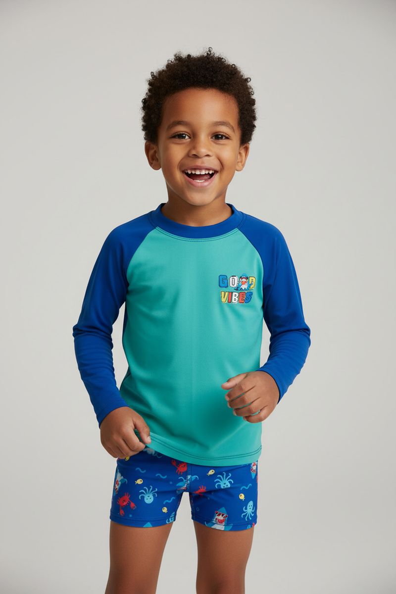 Prepare seu pequeno para a diversão com o Conjunto Rash UV Sunga Tubarão Caedu! Feito em MICROFIBRA, oferece proteção solar e conforto. Com estampa de tubarões e a frase 'GOOD VIBES', é a moda praia infantil perfeita para aventuras aquáticas. Garanta já a roupa ideal para seu filho!
