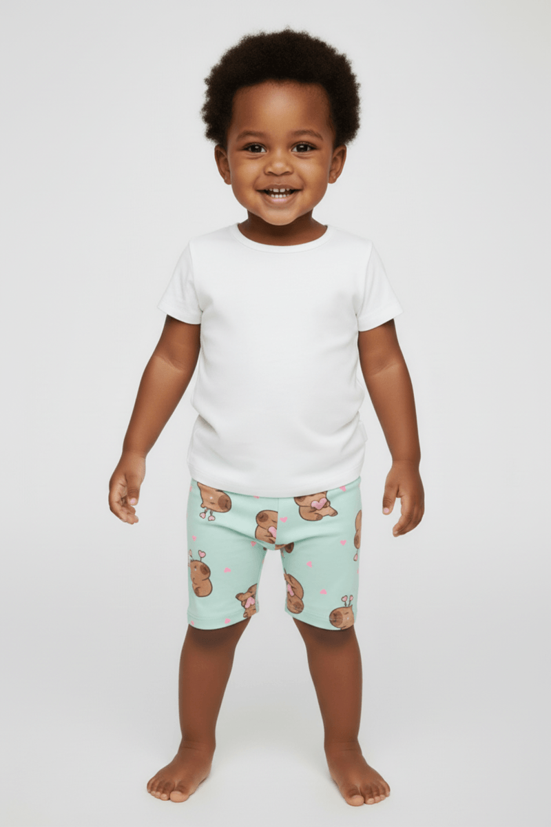 A Bermuda Ciclista Infantil Caedu oferece o máximo de conforto com seu material em cotton. Perfeita para os pequenos, possui uma estampa aqua de animais lúdicos em verde água, garantindo estilo e diversão. Uma roupa ideal para o dia a dia, unindo moda e bem-estar.