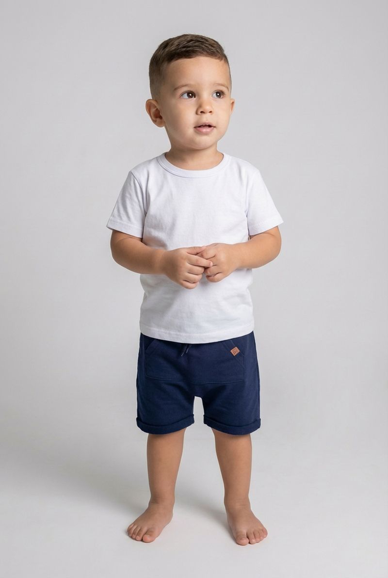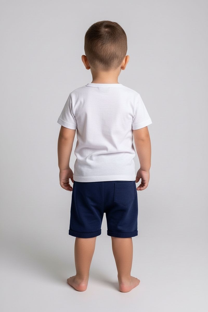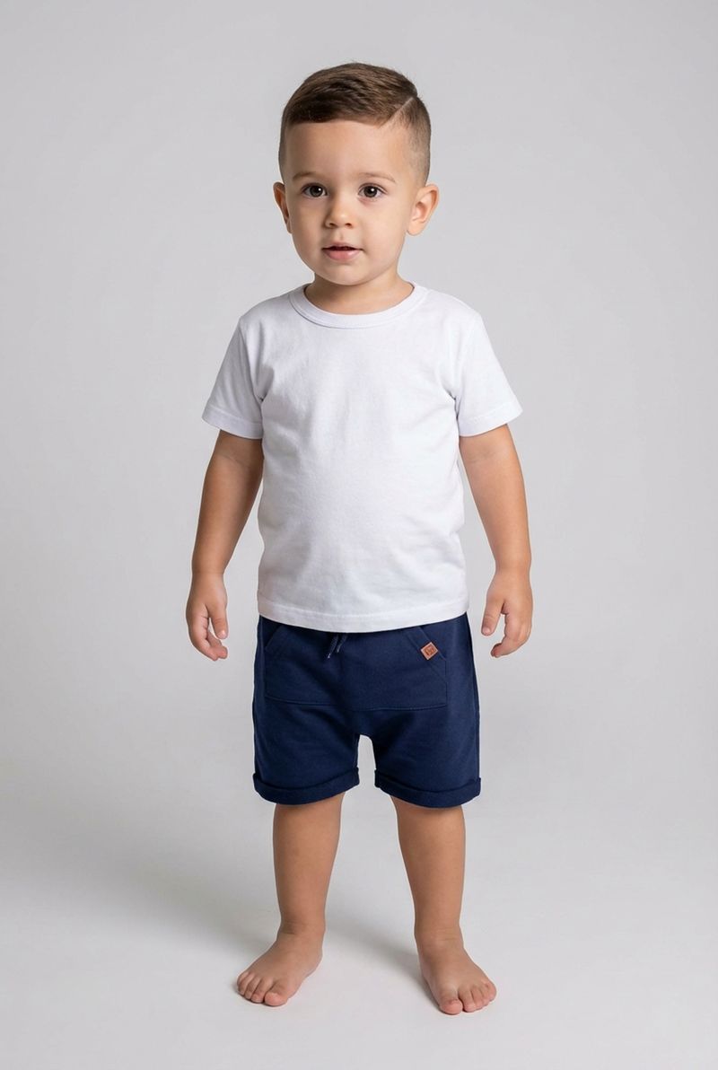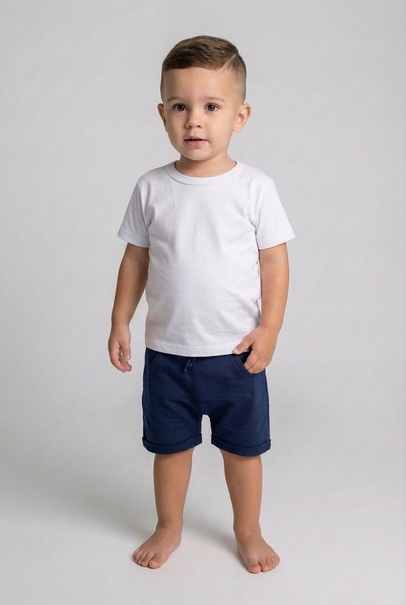 Combine o shorts infantil azul escuro com camisetas brancas ou coloridas para um visual despojado. Para um toque extra de estilo, adicione um boné e finalize com tênis confortáveis ou sandálias. É a peça chave para criar looks versáteis e cheios de personalidade para os pequenos.