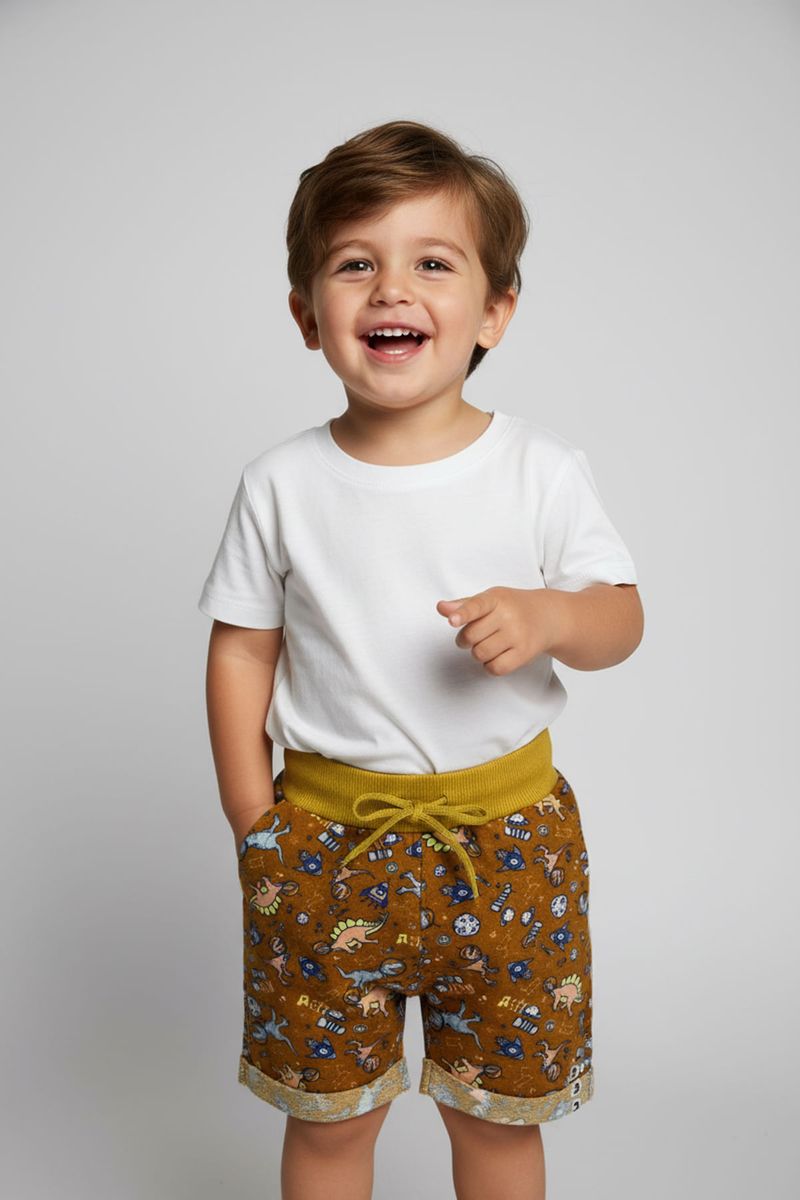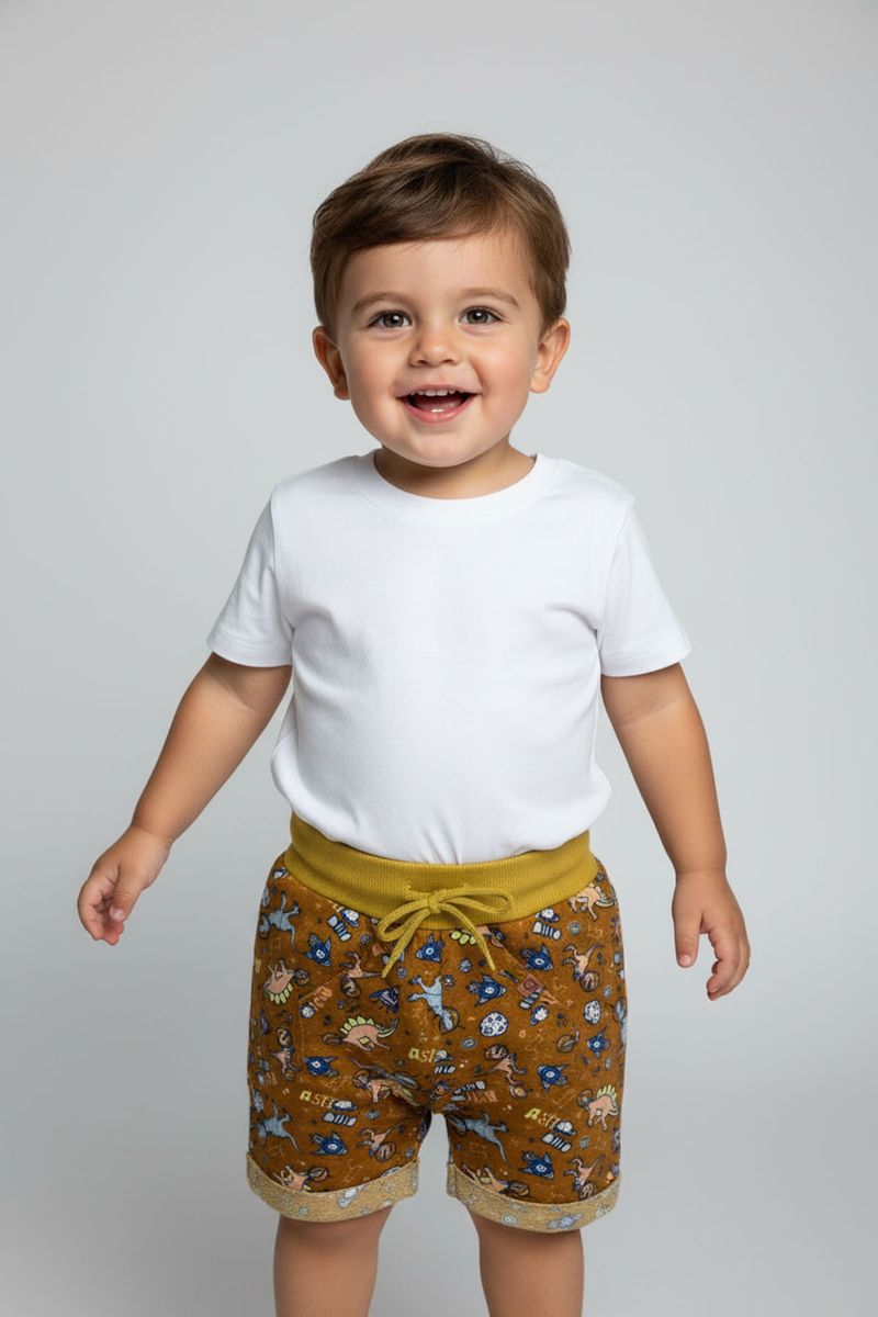 Combine a bermuda infantil mostarda com camisetas brancas ou em tons neutros para destacar a estampa de dinossauros. Para um visual despojado, adicione tênis coloridos. Em dias mais frescos, uma jaqueta jeans completa o look com muito charme, criando um conjunto versátil e moderno para seu pequeno.