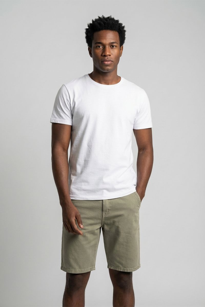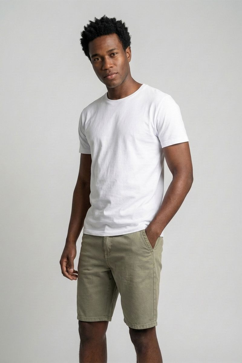 Combine sua bermuda verde médio com camisetas básicas brancas ou cinzas para um look casual. Para um toque mais arrumado, experimente camisas de botão de linho. Complete com tênis esportivos ou sapatênis para um visual despojado e moderno.