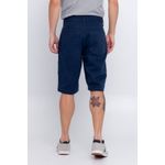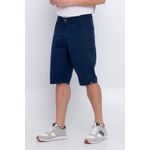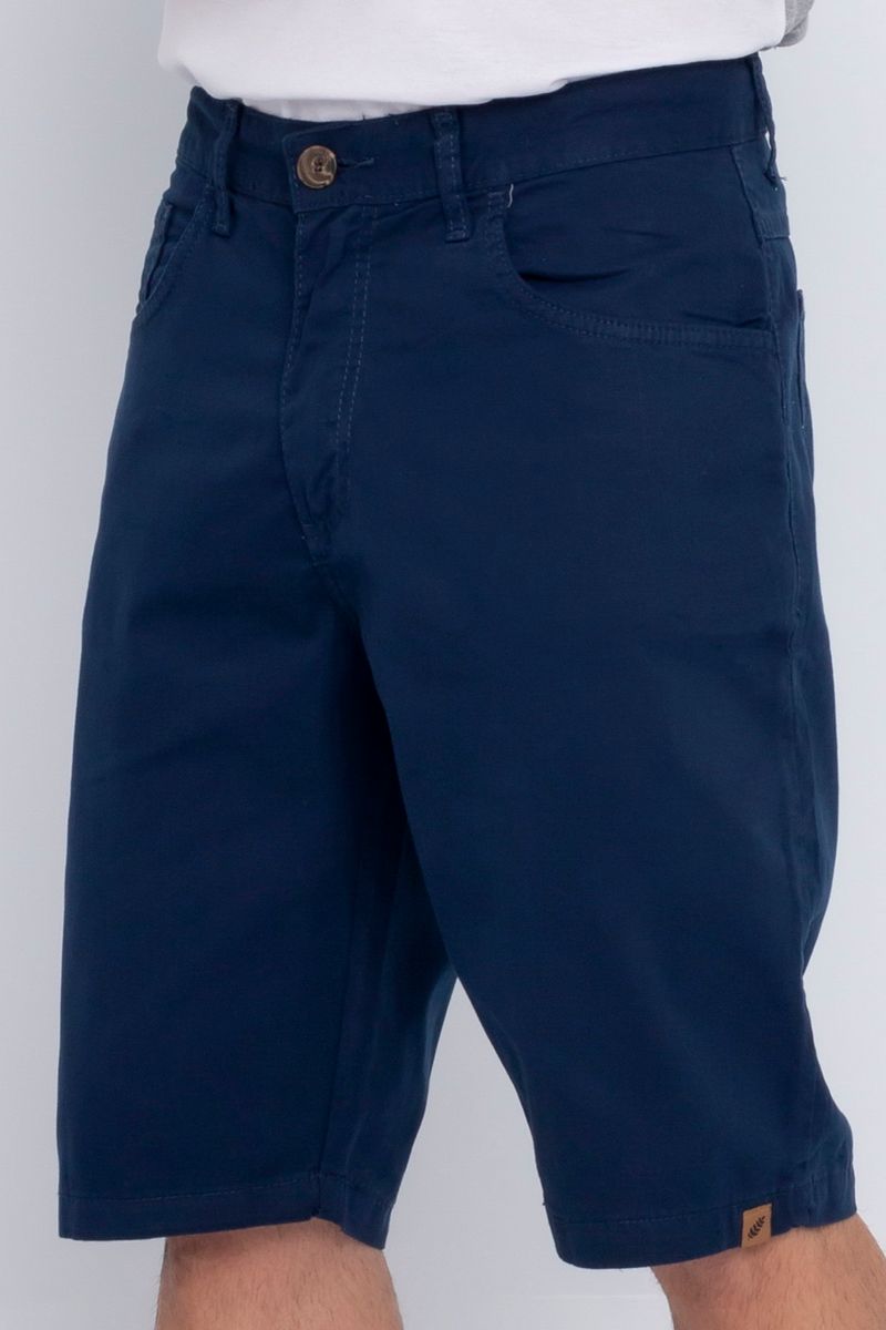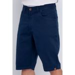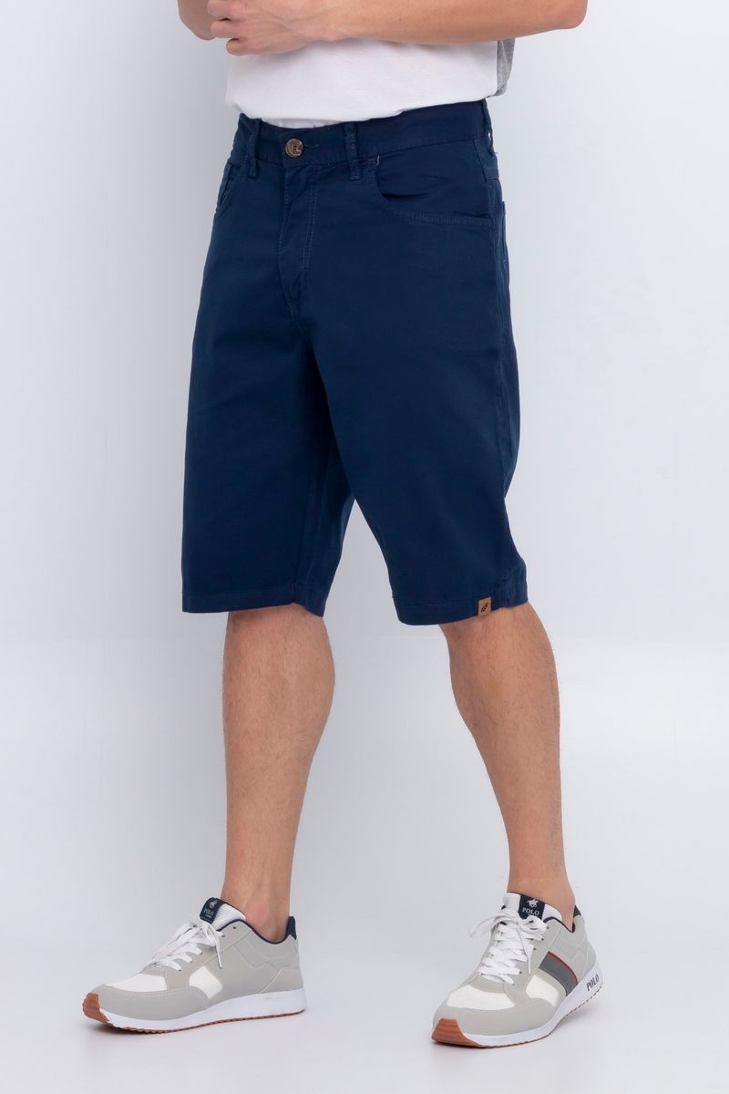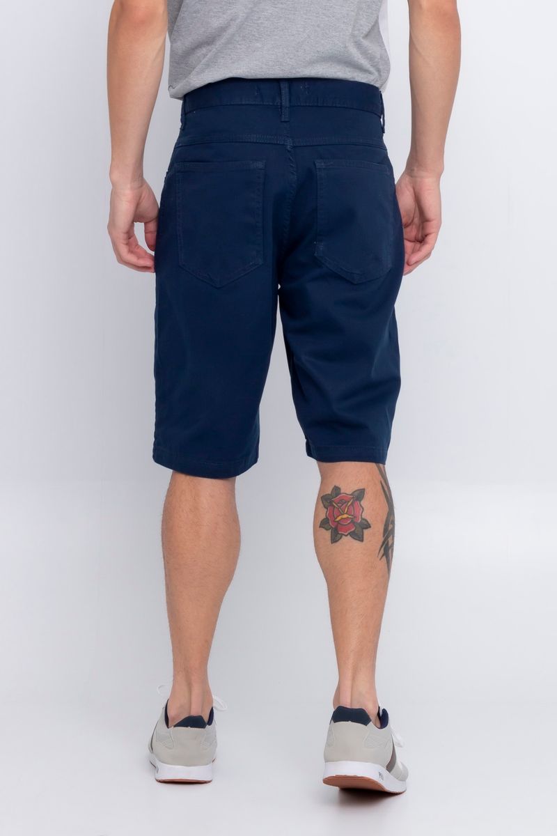 Bermuda masculina, modelagem básica. A peça possui bolsos funcionais, comprimento médio e fechamento em zíper e botão.