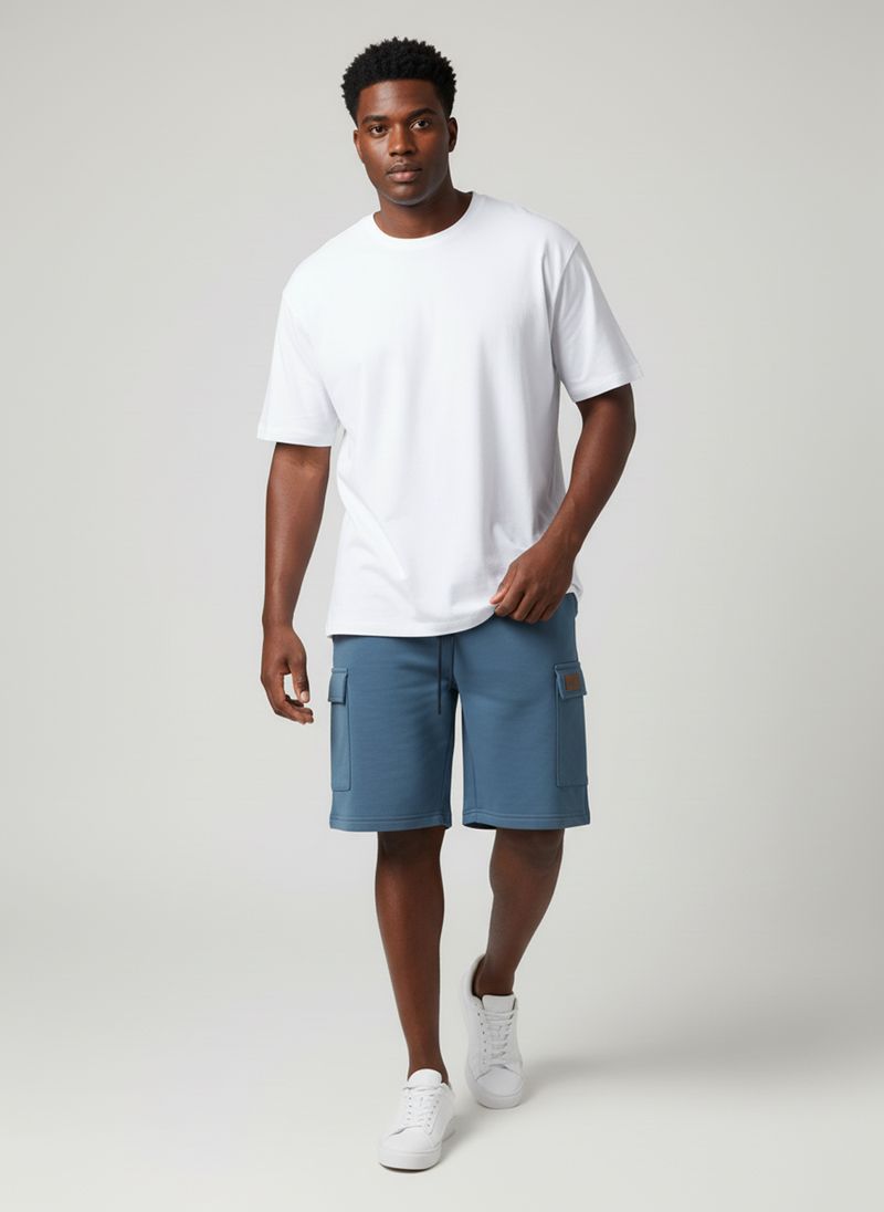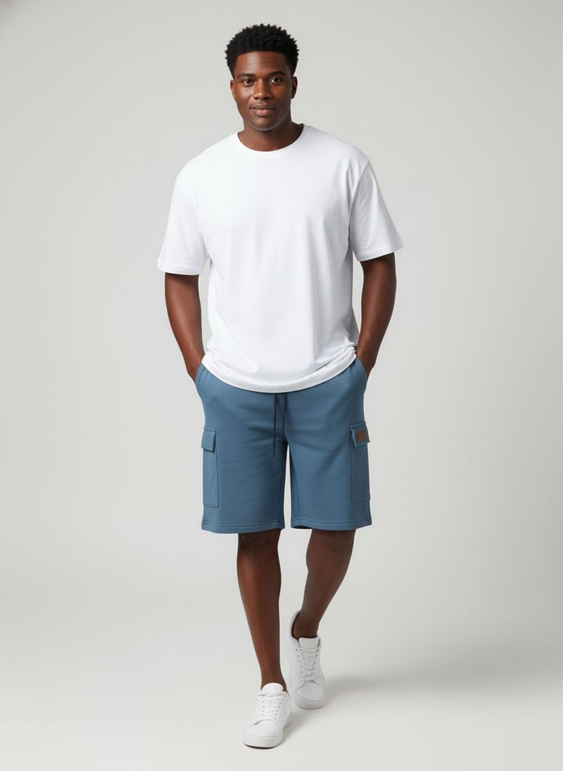 Desfrute de conforto e estilo com a Bermuda Cargo Masculina Caedu. Feita em moletom azul médio, possui bolsos cargo e cós ajustável. Uma roupa essencial para a moda casual masculina.