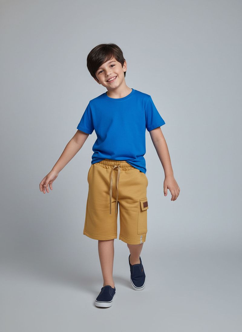 A Bermuda Cargo Infantil de Moletom Amarelo Mostarda Caedu oferece conforto e estilo para os pequenos. Feita em moletom sem felpa de poliéster, possui cós elástico ajustável e práticos bolsos cargo, ideal para aventuras diárias. Uma peça versátil da moda infantil Caedu.
