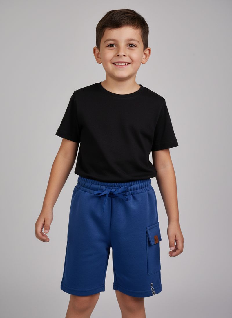 A Bermuda Cargo Infantil Masculina de Moletom Azul Médio Caedu garante conforto e estilo. Com moletom sem felpa, cós elástico ajustável e bolsos cargo, é ideal para a liberdade das aventuras diárias. Uma roupa infantil moderna e durável.