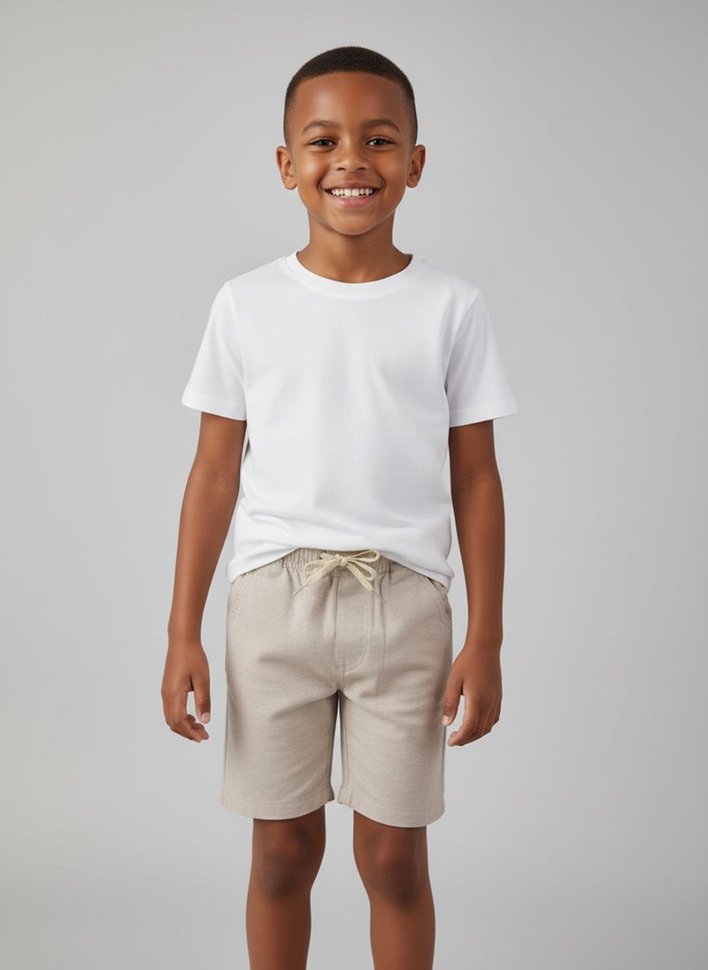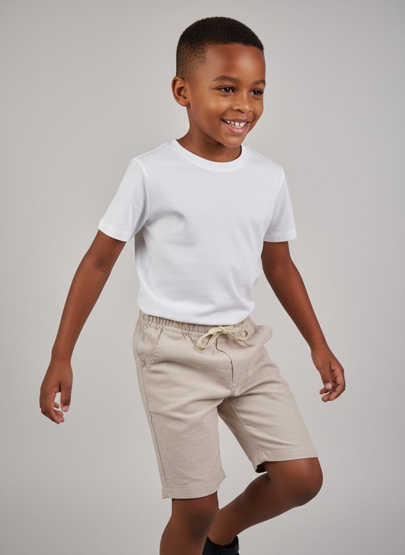 Combine a bermuda sarja bege claro com uma camiseta básica branca para um visual casual e despojado, como visto na imagem. Para um toque de cor, opte por camisetas estampadas ou regatas vibrantes. Complete o look com tênis confortáveis ou sandálias, e adicione um boné para um estilo ainda mais divertido e prático. Uma peça versátil para a roupa infantil.