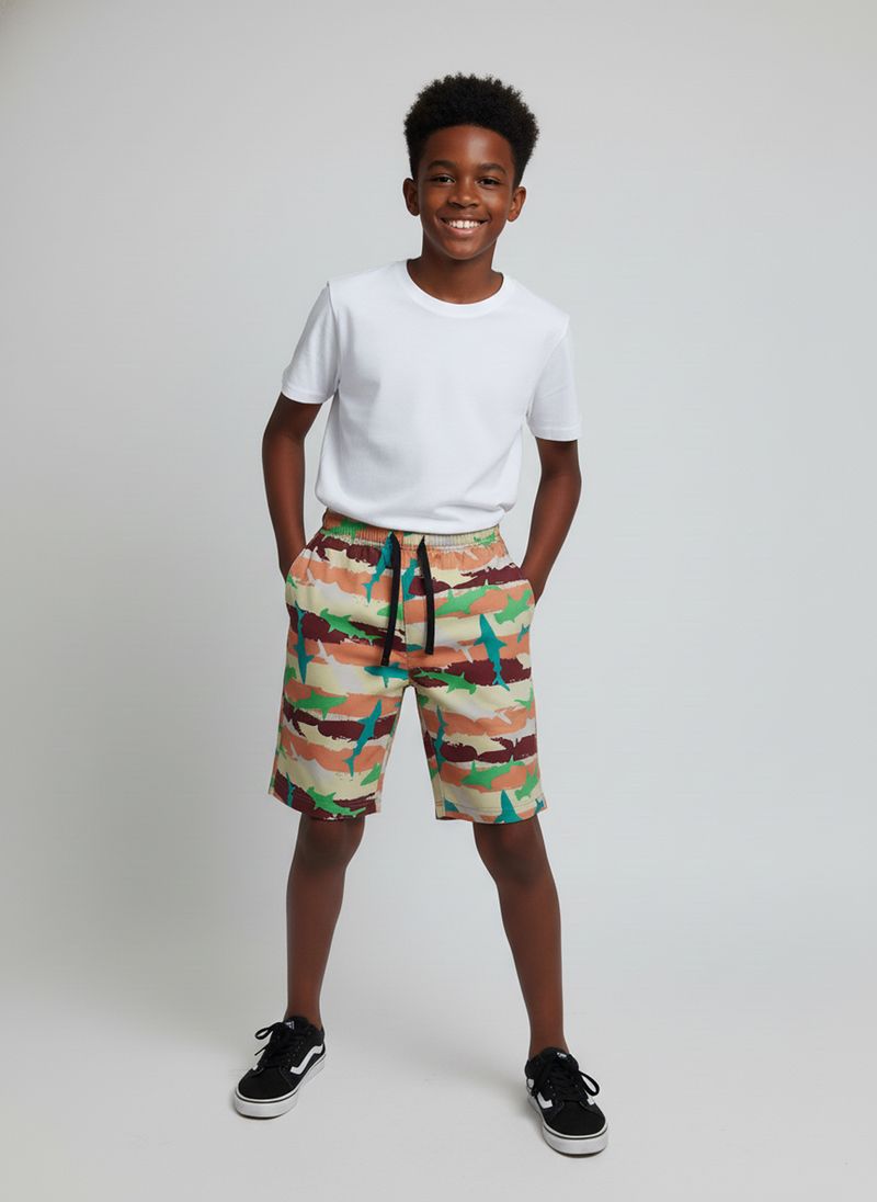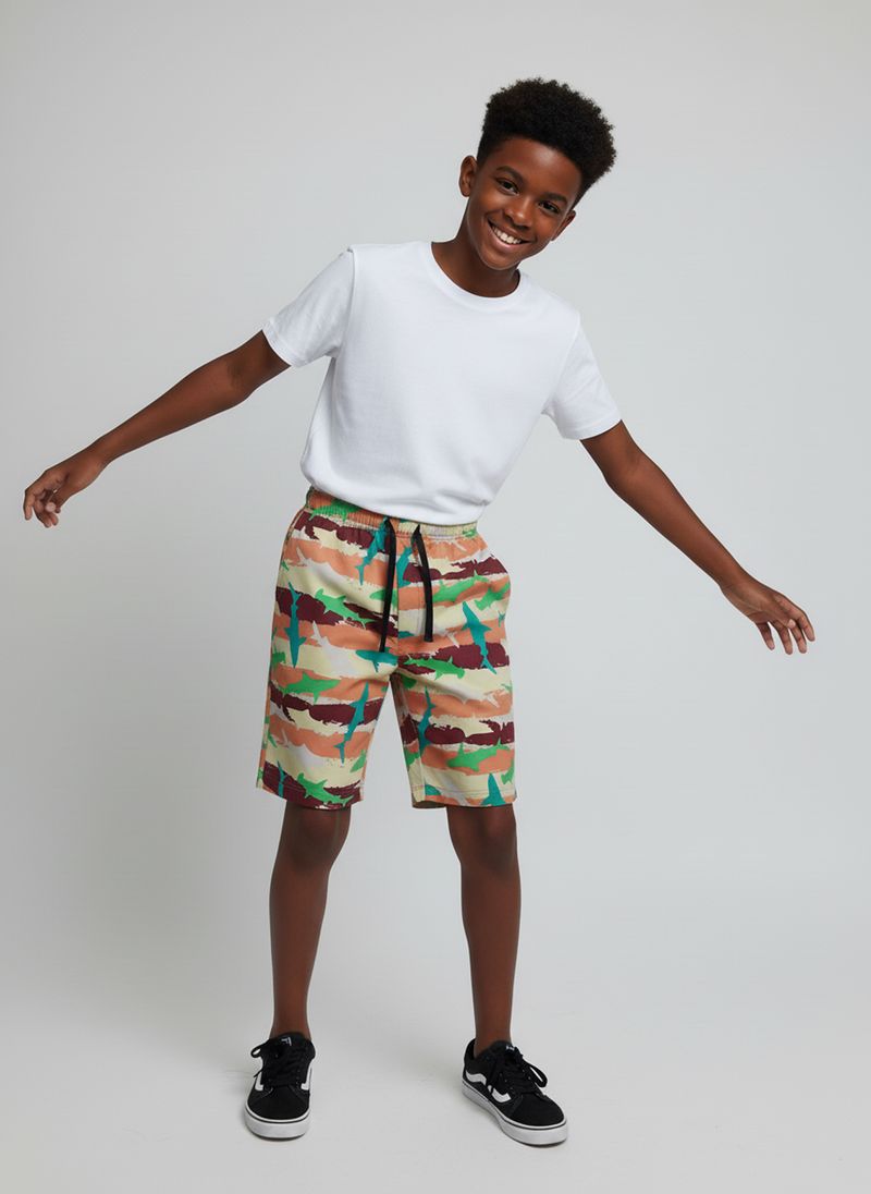A Bermuda Tactel Infantil Estampada Tubarão Camuflado Caedu oferece conforto e leveza. Em 100% poliéster tactel, com estampa de tubarões e camuflagem, garante estilo e liberdade para brincar, perfeita para a moda infantil.