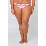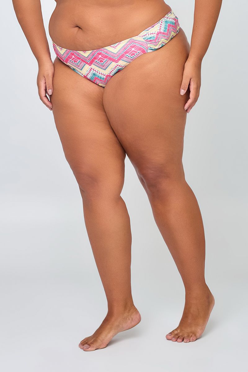 Modelo plus size. Calcinha de biquíni com estampa étnica. Confortável e cheia de estilo.