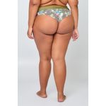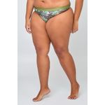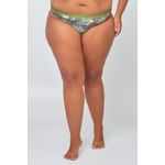 Modelo plus size. Calcinha de biquíni com estampa tropical. Charmosa e confortável.