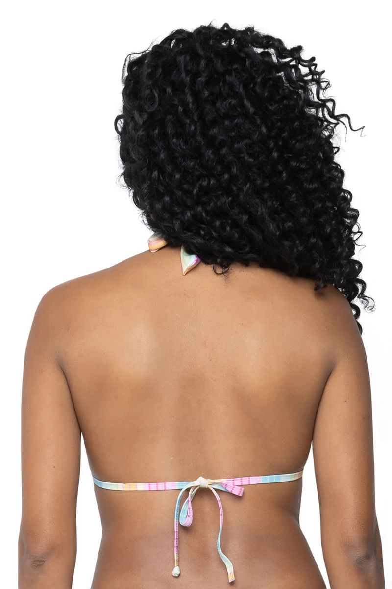 Top biquíni com estampa. Possui tiras para amarração no pescoço e nas costas, forro, bojo, acabamento e costura no tom.