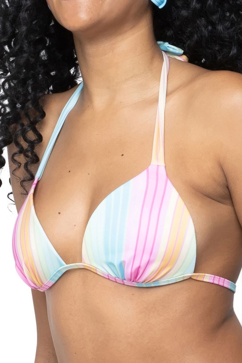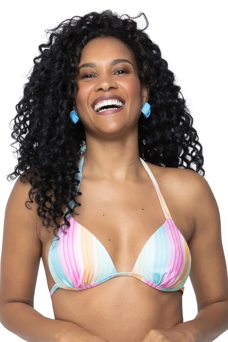 VestuárioOfertasNovidadesModa PraiaFemininoBiquínisTop Biquíni com Bojo Estampa Listras Azul Rosa e Laranja