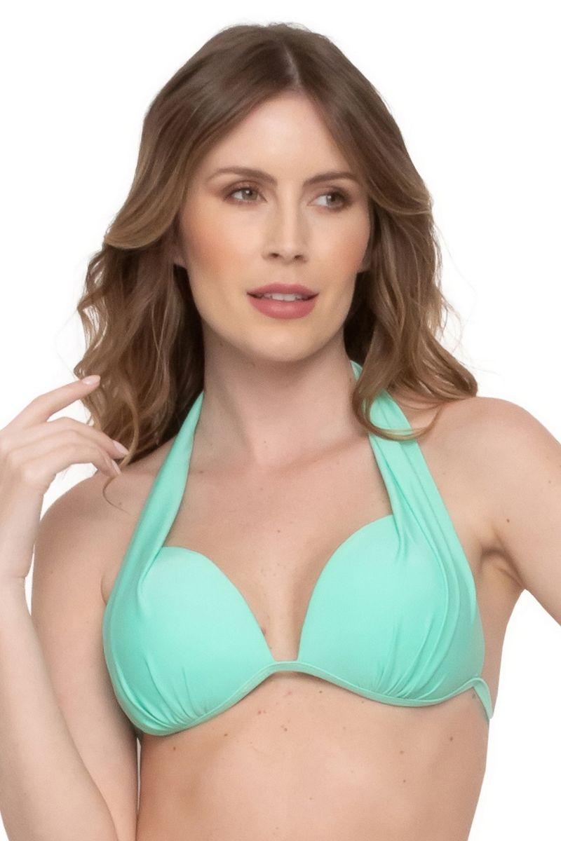 Biquíni top triângulo fixo, com bojo liso verde água, alças largas e amarração nas costas. Leve e confortável, o modelo é charmoso e cheio de estilo, oferecendo um belo visual aos seios. A peça é indispensável nos looks de praia/piscina e perfeita para o