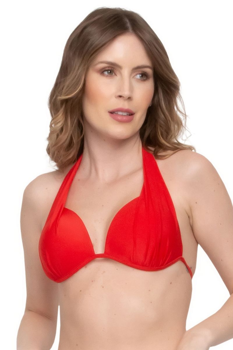 Biquíni top triângulo fixo, com bojo liso vermelho, alças largas e amarração nas costas. Leve e confortável, o modelo é charmoso e cheio de estilo, oferecendo um belo visual aos seios. A peça é indispensável nos looks de praia/piscina e perfeita para o ba