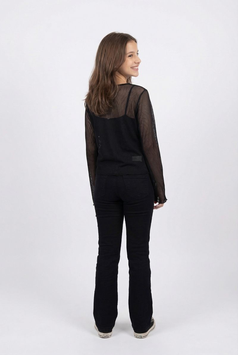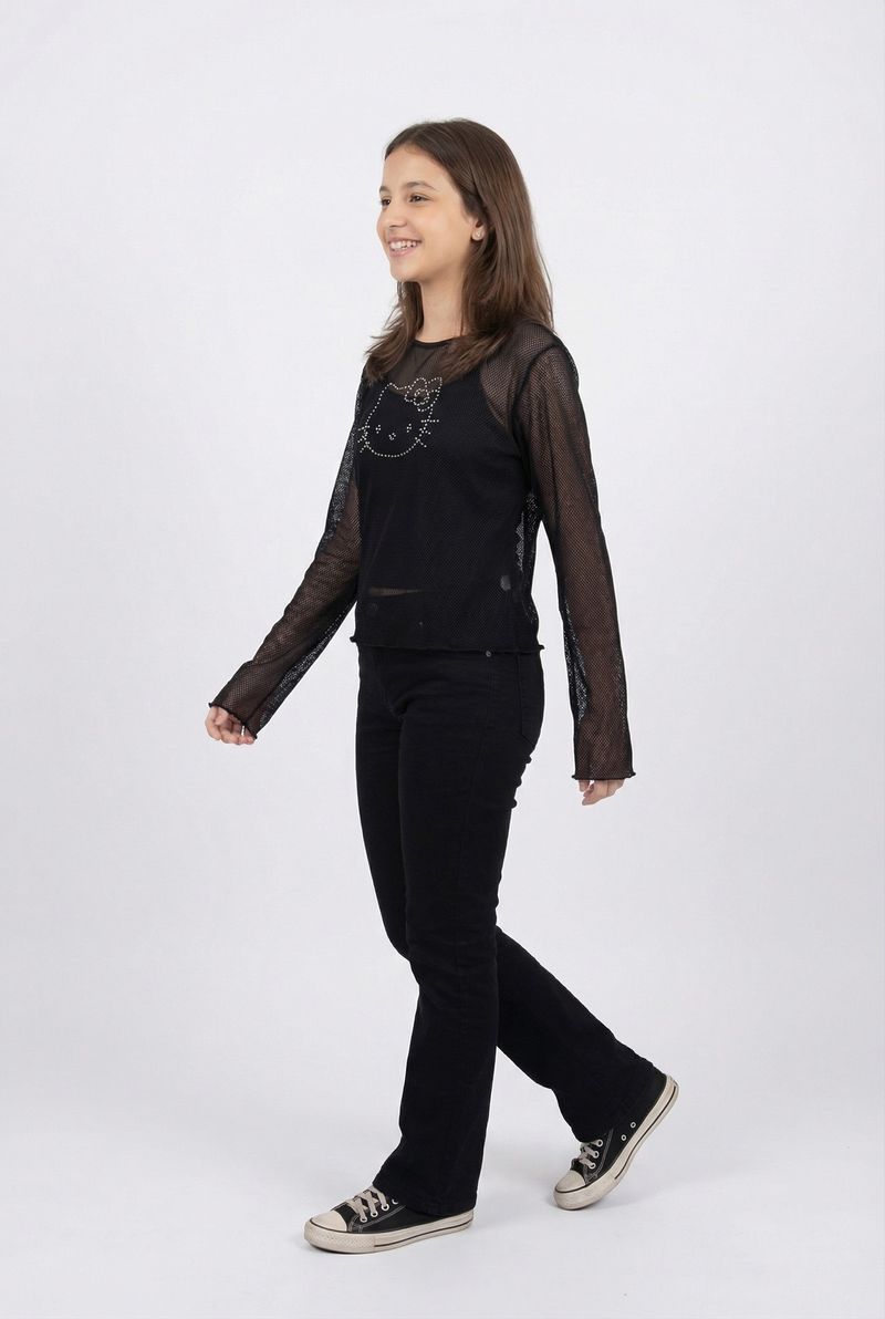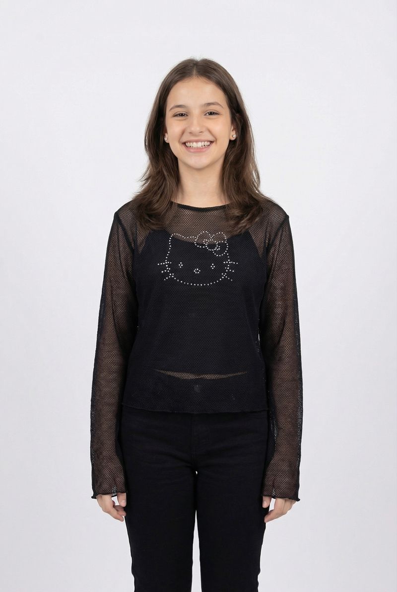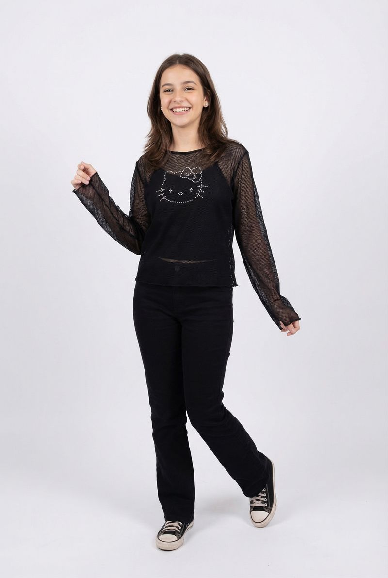 A Blusa Juvenil Hello Kitty em Tela Arrastão Preta com Strass da Caedu é a peça ideal para meninas que amam moda e brilho. Com seu tecido de malha arrastão e a icônica Hello Kitty em strass, oferece um visual moderno e divertido, perfeito para expressar personalidade com muito estilo.