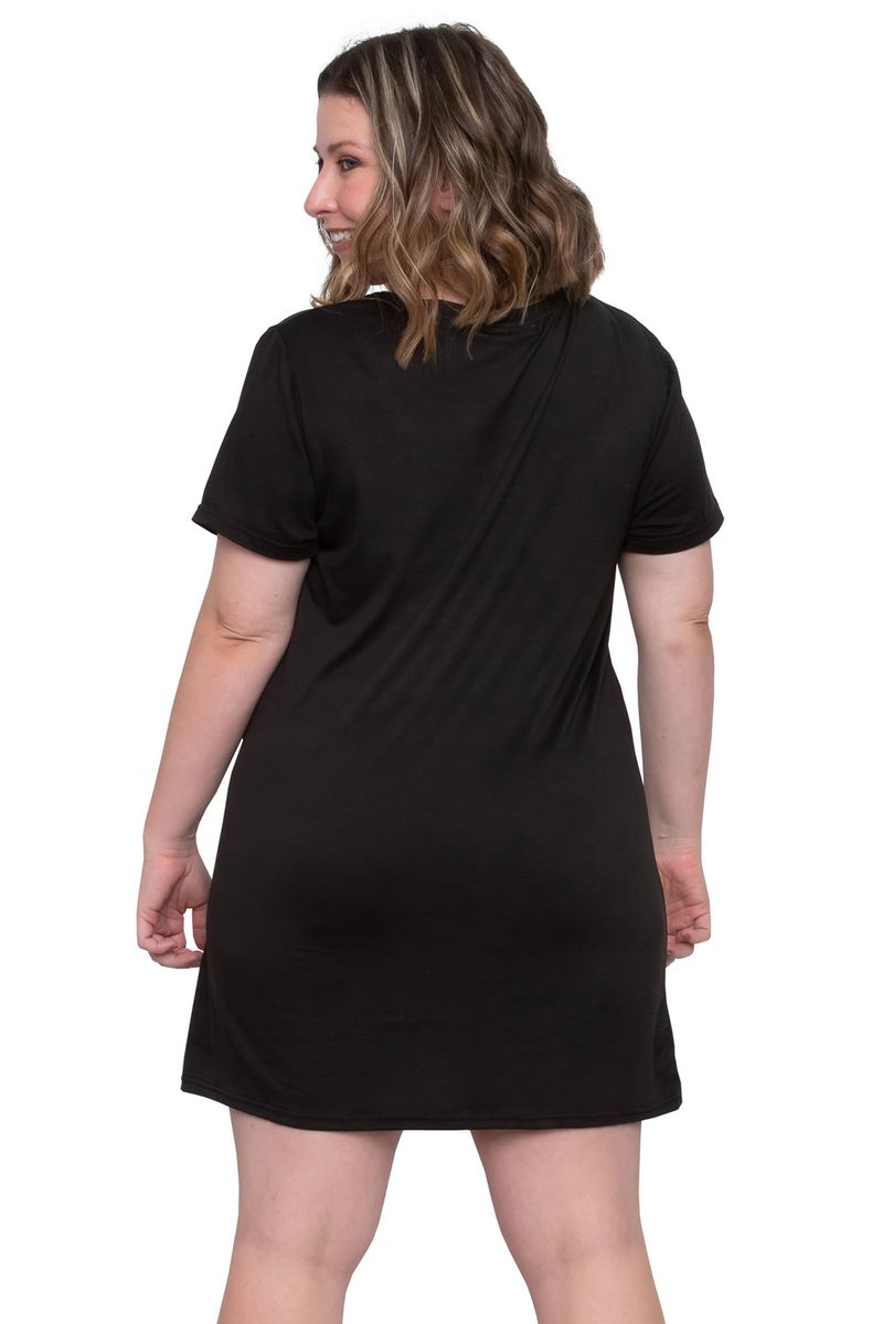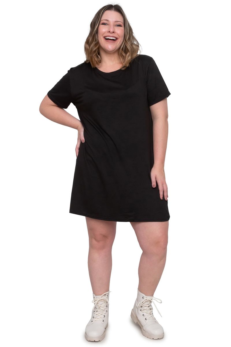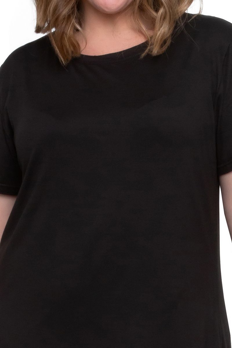 Blusa casual feminina, com modelagem alongada. A peça é lisa na cor preta. Modelo plus size.