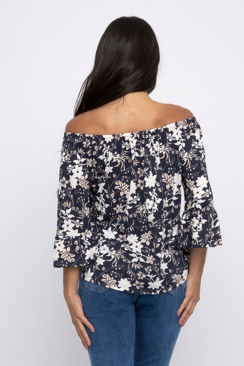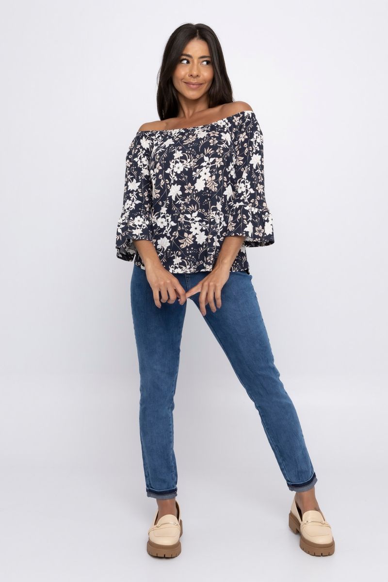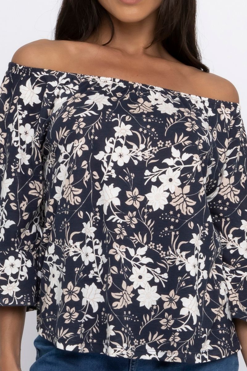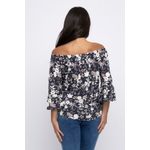 Blusa feminina com modelagem ciganinha. A peça possui estampa floral, decote ombro a ombro e manga curta.