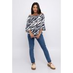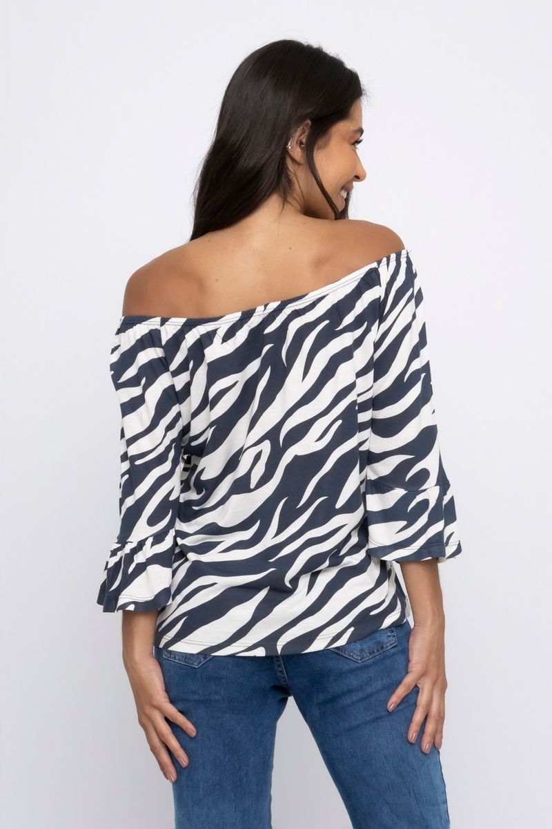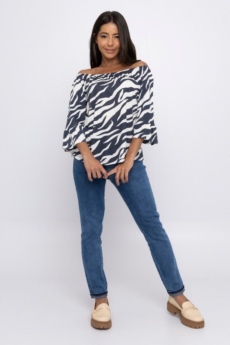 Blusa Ciganinha Feminina com Estampa Zebra Azul Marinho e Branco