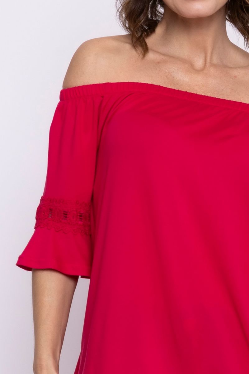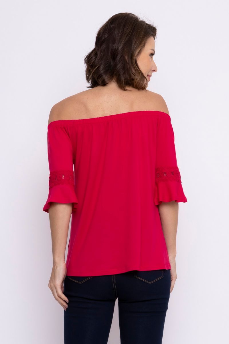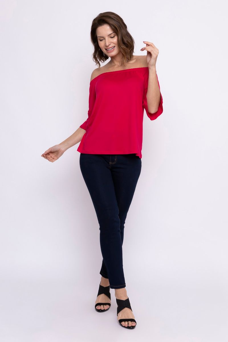 Blusa feminina com modelagem ciganinha. A peça possui decote ombro a ombro e manga 3/4.