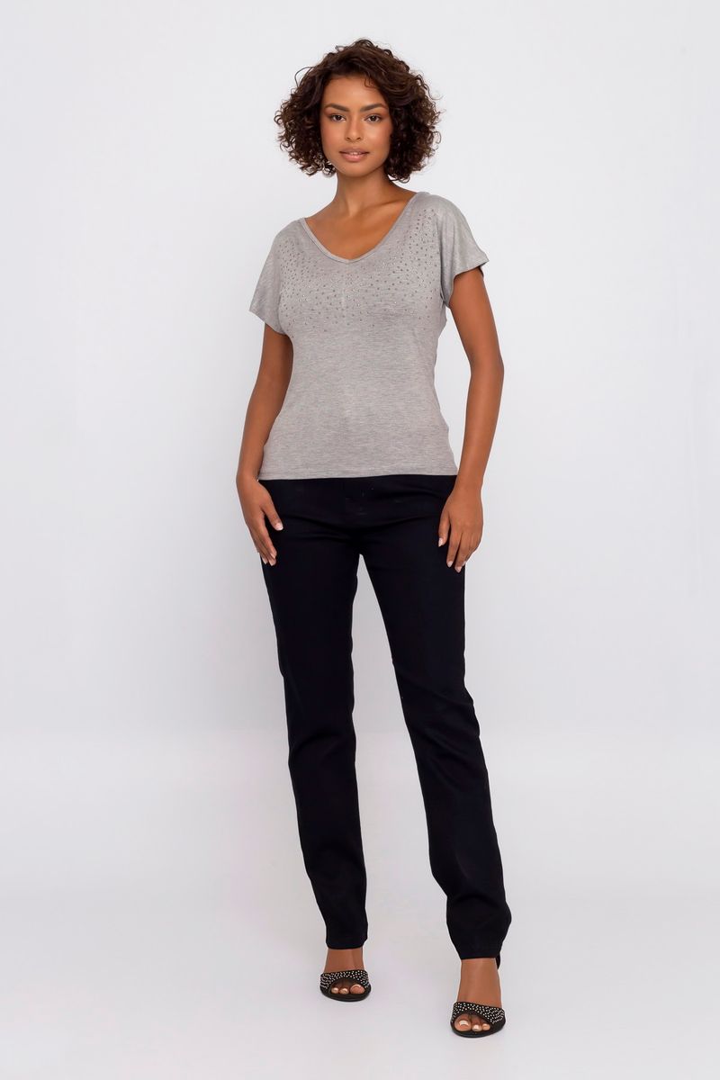 Blusa feminina casual. A peça possui hotfix aplicados, decote V, manga curta e caimento solto.