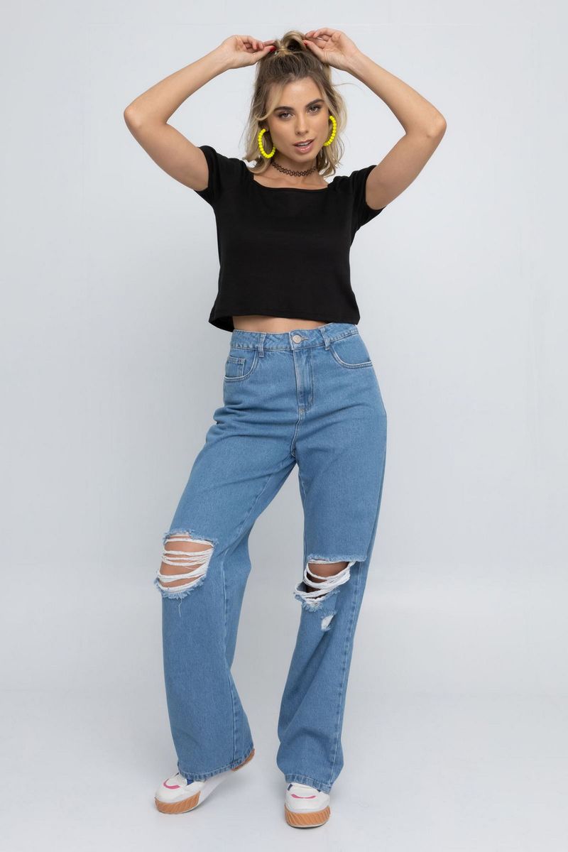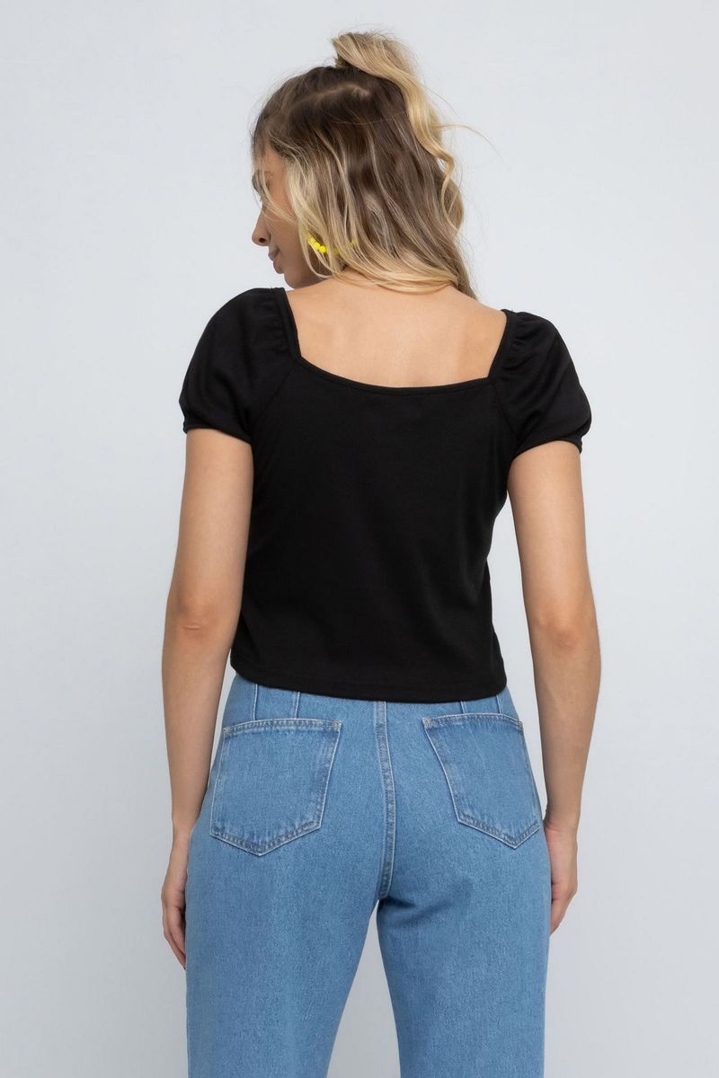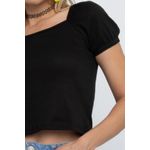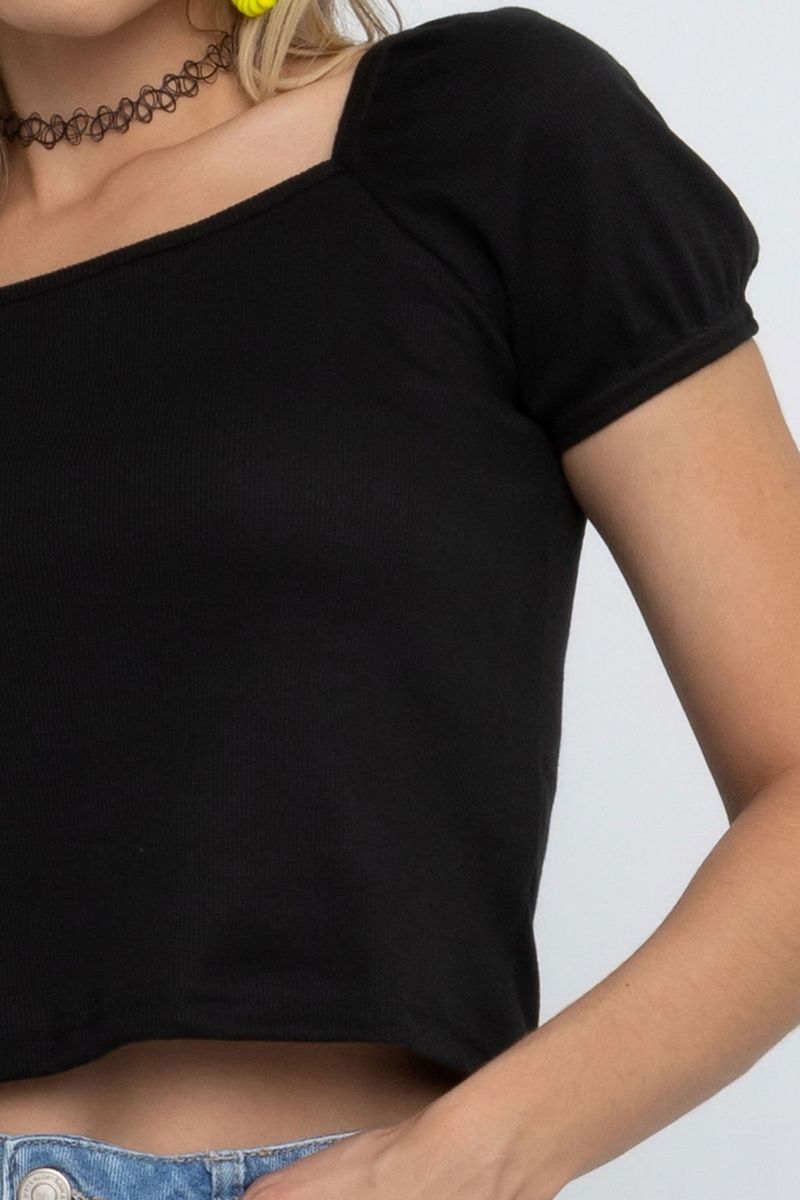 Blusa feminina lisa, modelo cropped, confeecionada em ribana. Possui decorte quadrado e manga curta.