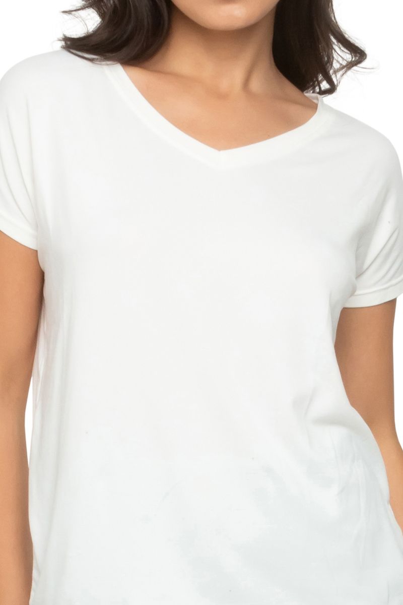 Blusa feminina lisa branca de manga curta com decote V.