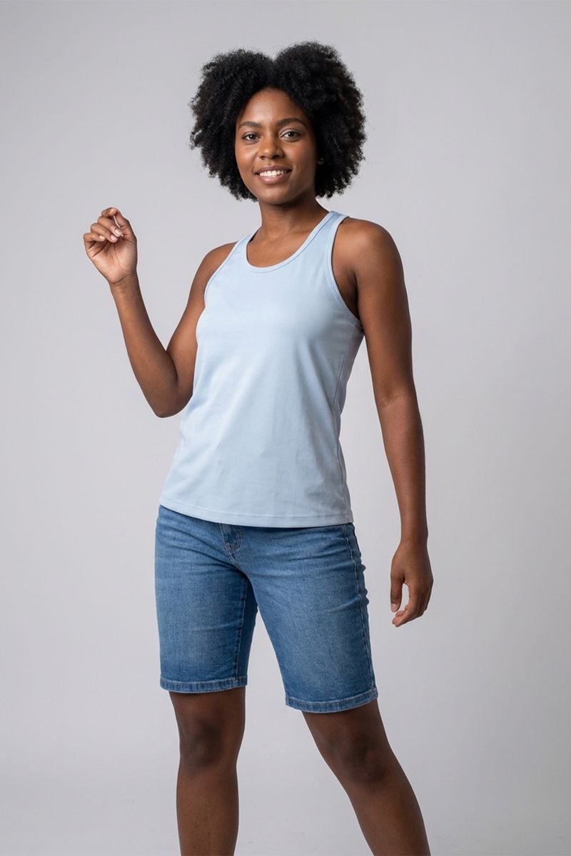 Combine sua regata azul clara com shorts jeans para um visual casual e despojado. Adicione tênis brancos ou sandálias rasteirinhas para um toque de leveza. Para um estilo mais urbano, use com calças de sarja e um boné. A versatilidade da peça permite diversas composições.