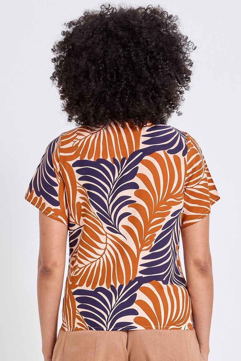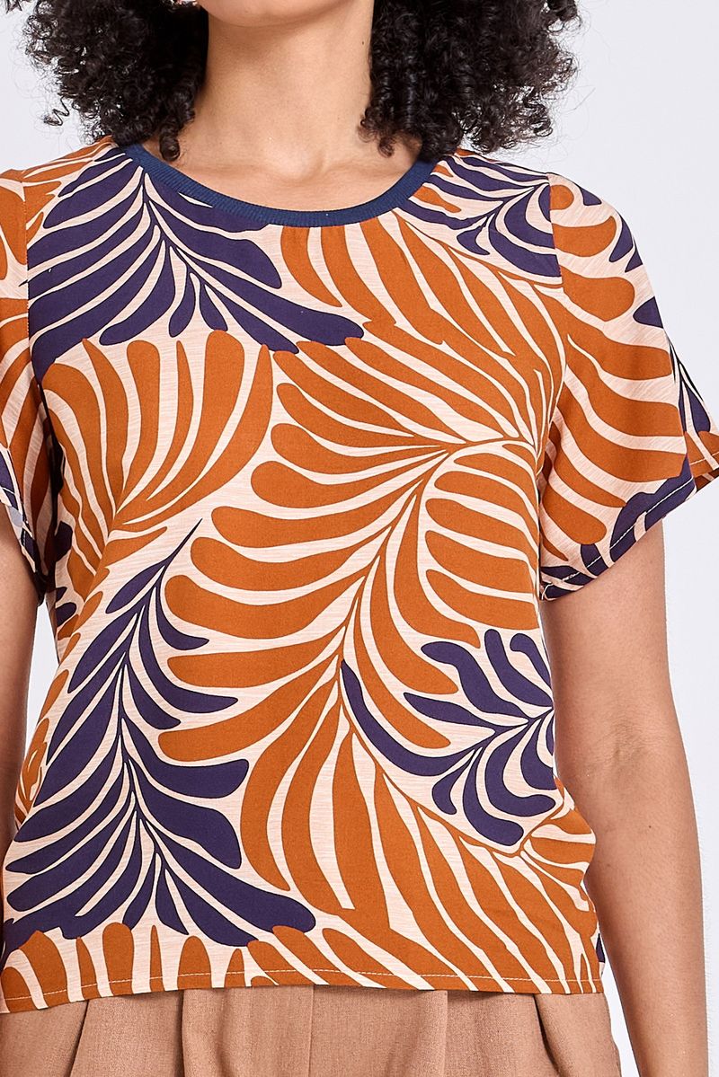 Desperte seu estilo com a Blusa Feminina Estampa Folhagem Tropical Manga Curta Caedu. Confeccionada em 100% poliéster, esta peça oferece conforto e leveza. Sua estampa vibrante de folhagem abstrata em tons terrosos e azul marinho adiciona um toque de moda e personalidade ao seu guarda-roupa. Perfeita para quem busca roupas com um visual único e moderno.