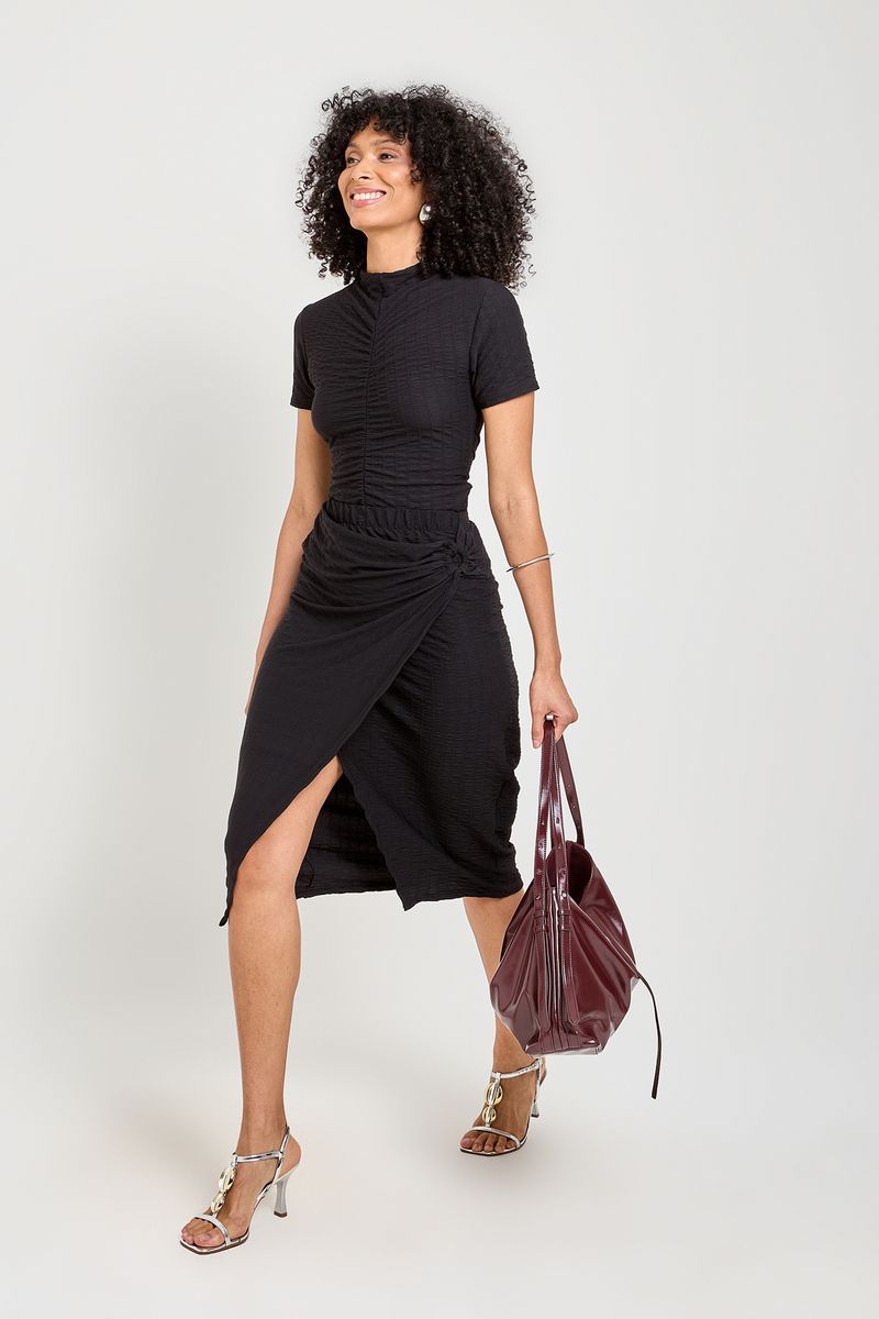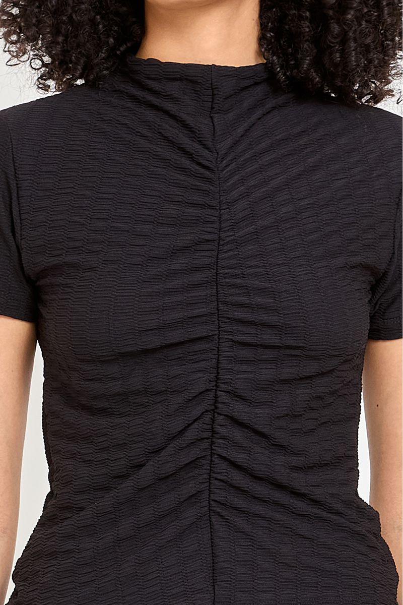 A Blusa Feminina Preta Franzida Caedu oferece um toque de elegância e modernidade. Com gola semi-alta e manga curta, seu detalhe franzido vertical e textura sutil garantem um visual único e confortável para a mulher que busca moda feminina e estilo.
