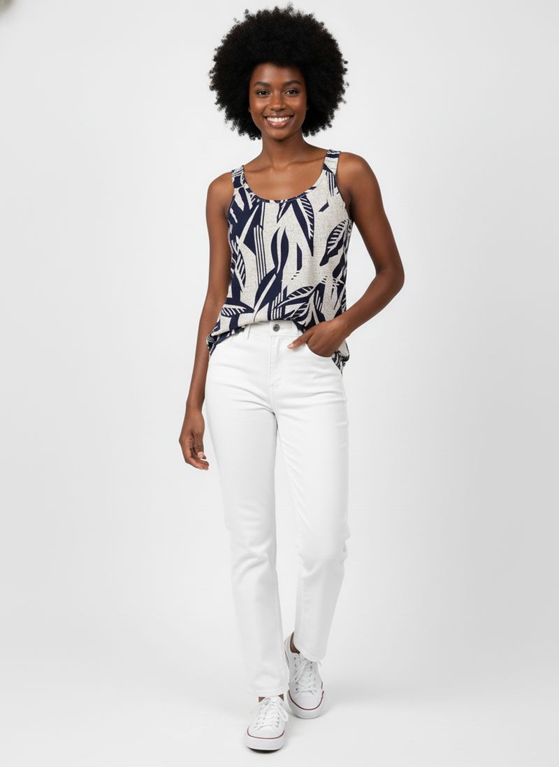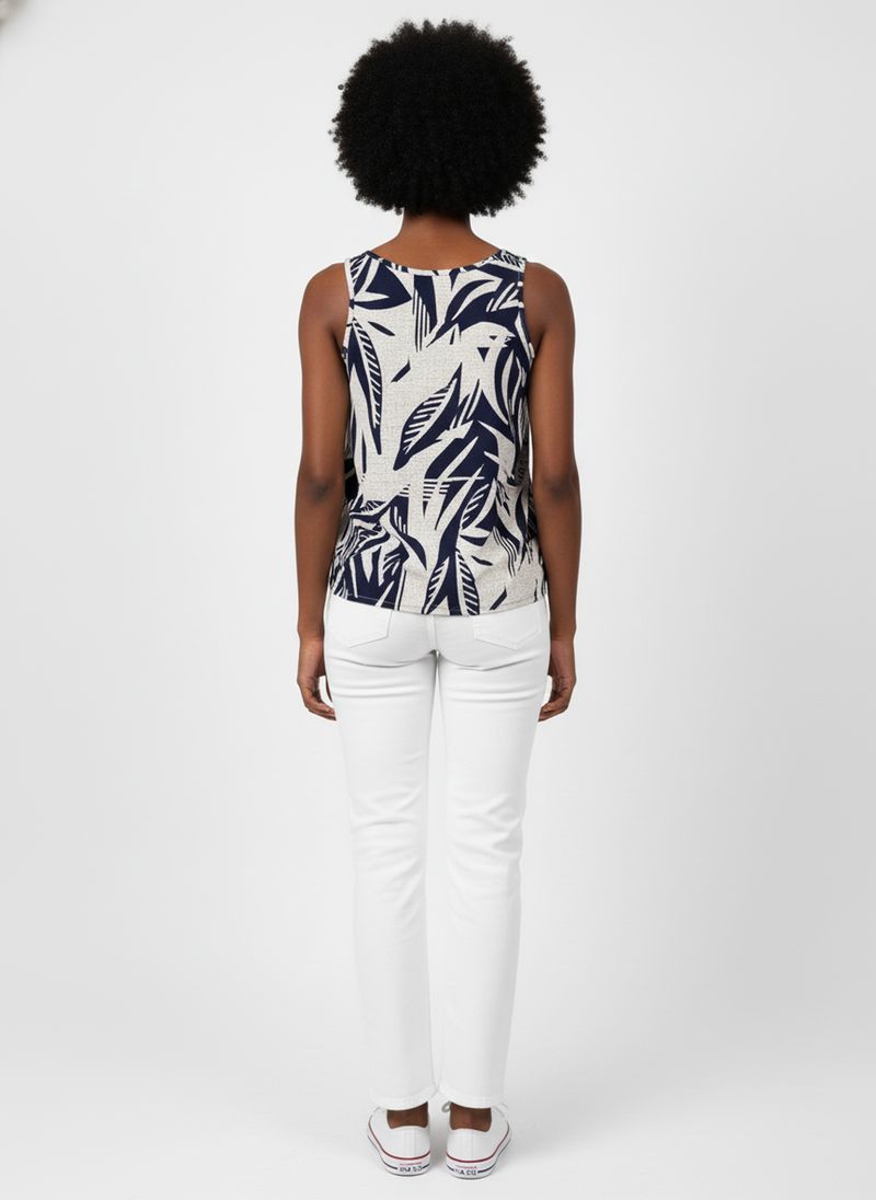 A Regata Feminina Caedu Estampa Folhagem Tropical oferece um toque de leveza e elegância para seu guarda-roupa. Com seu design estampado em azul marinho e off-white, decote redondo e alças largas, esta peça em VISCOLYCRA garante conforto e estilo para a moda feminina.