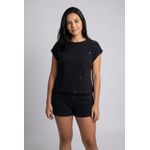 Combine esta blusa com shorts pretos para um visual despojado e moderno, como visto na imagem. Para um estilo casual chic, use com calças jeans de cintura alta e tênis brancos. Se a ocasião pedir mais elegância, aposte em uma saia midi e sandálias de salto. Adicione um blazer para um toque sofisticado.