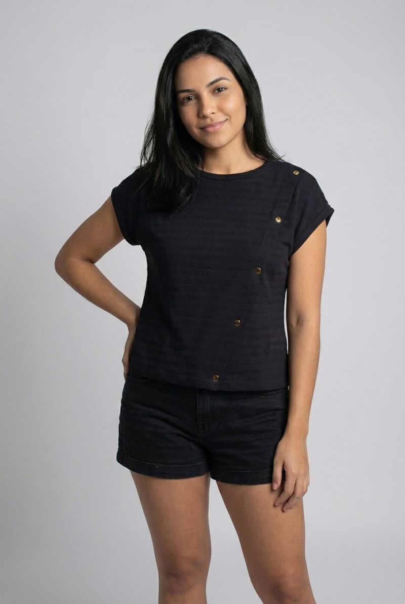 A Blusa Feminina Caedu, em POLIESTER, é a peça ideal para a moda. Seu design moderno com recorte diagonal, botões dourados e gola redonda oferece conforto e sofisticação. Uma roupa versátil para looks elegantes.