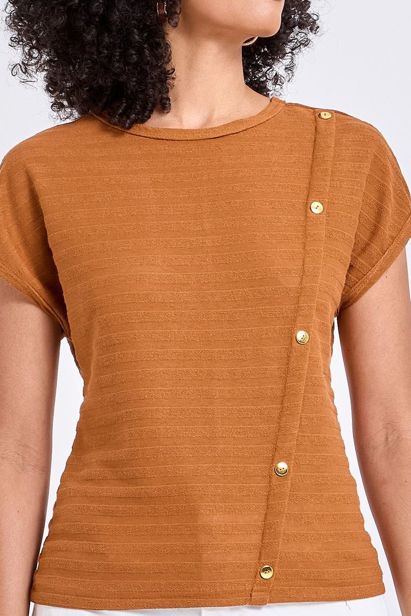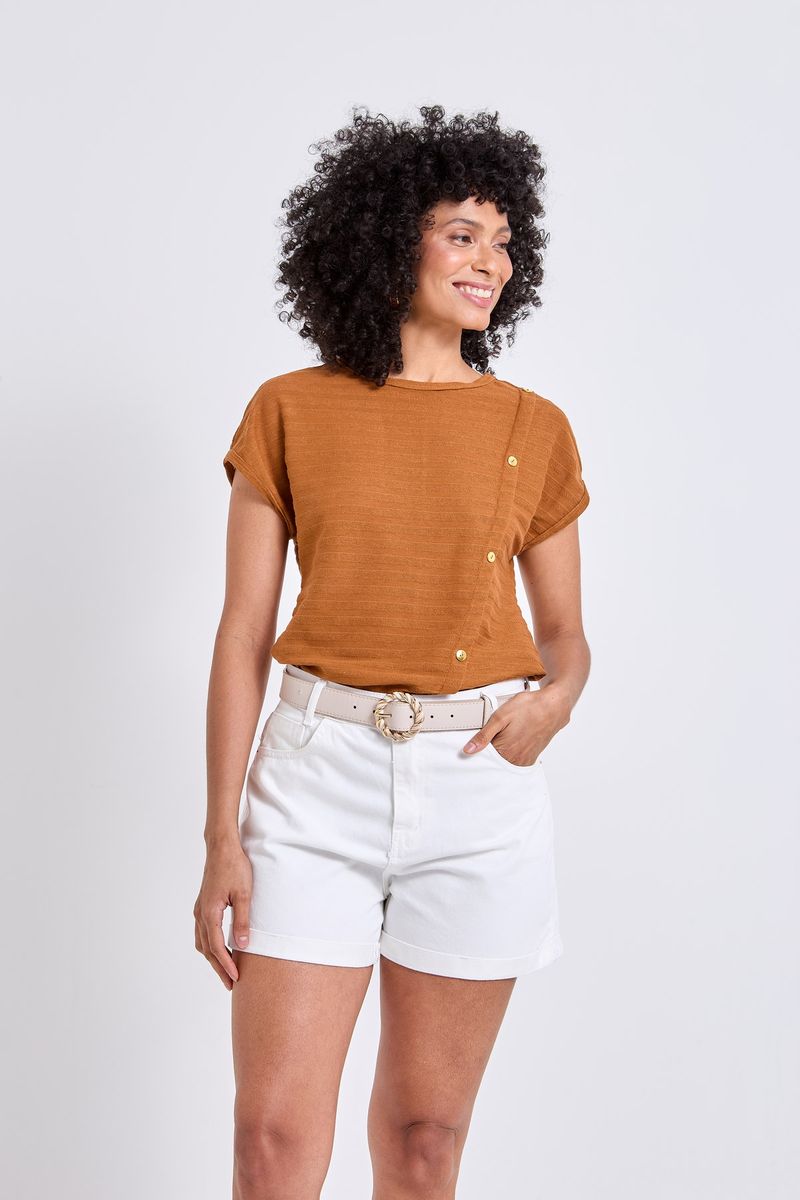 Descubra a Blusa Feminina Caedu, perfeita para elevar seu estilo. Com seu design assimétrico e botões dourados, esta peça em poliéster oferece um caimento solto e confortável, ideal para looks modernos e inspiradores. Uma roupa essencial para seu guarda-roupa.